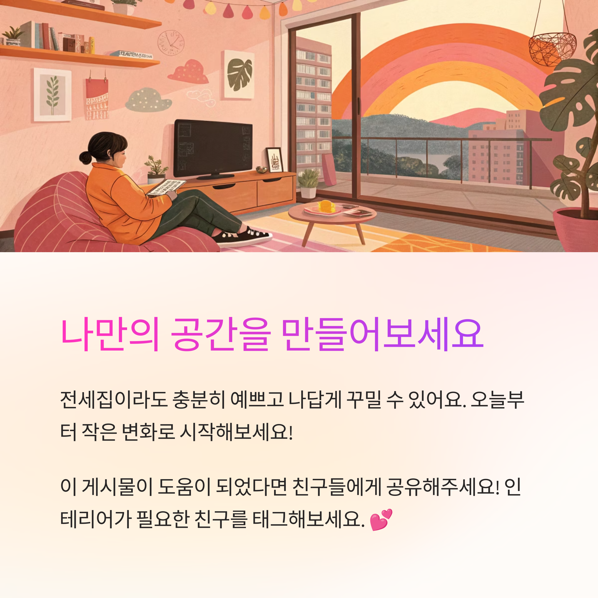 이런 아이템들만 잘 활용해도, 전세집을 내 취향에 맞게 바꾸는 건 전혀 어렵지 않아요. 중요한 건 어떤 분위기를 만들고 싶은지 미리 정하는 거예요. 그러면 효율적으로 쇼핑도 가능하답니다!