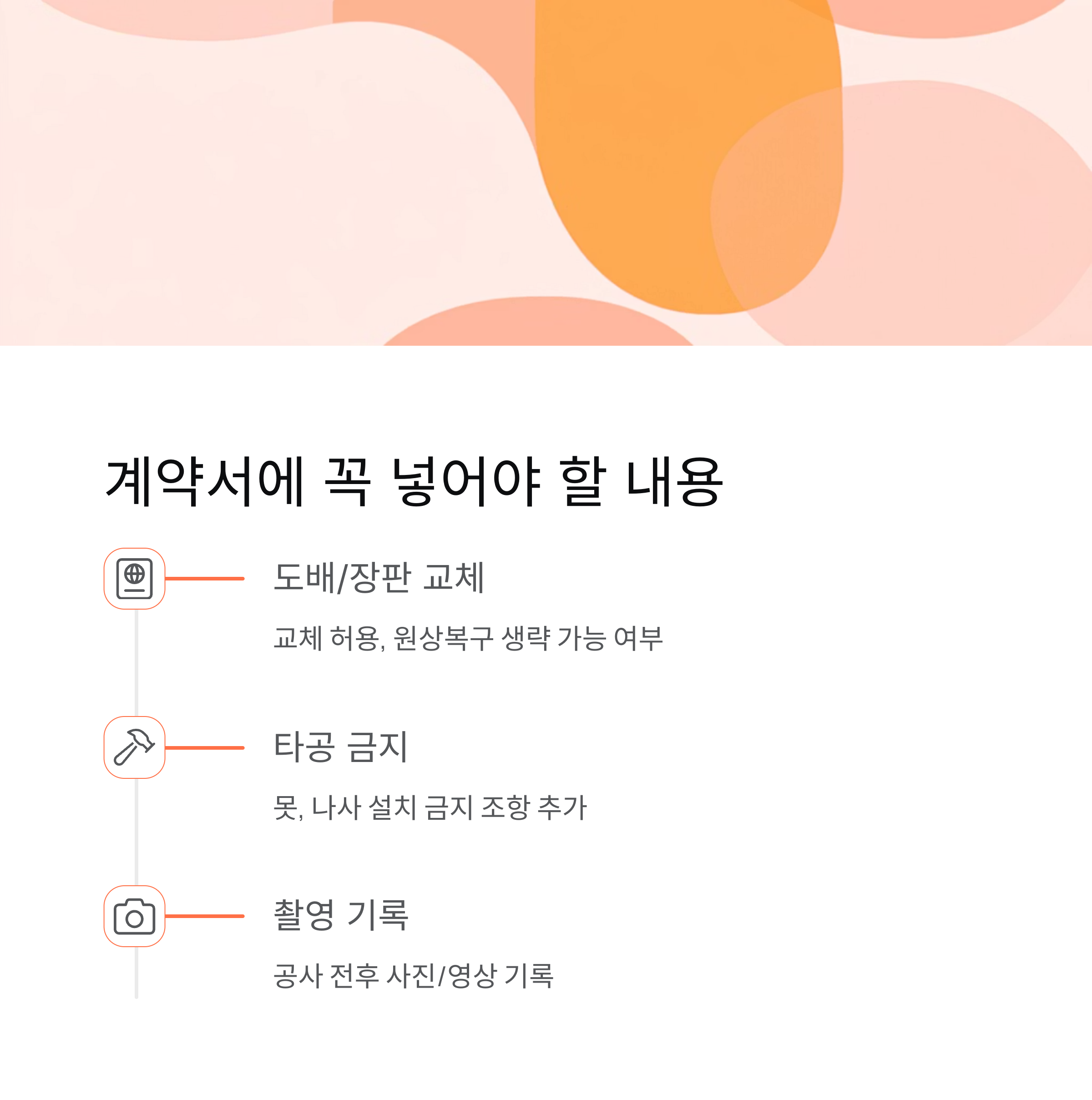 예를 들어 “도배와 장판은 세입자가 교체하되, 퇴거 시 원상복구하지 않는다” 같은 문구를 특약에 넣으면 명확하죠. 또는 “타공 금지”, “접착식 인테리어는 허용하되 흔적 없을 것” 등도 유용해요.