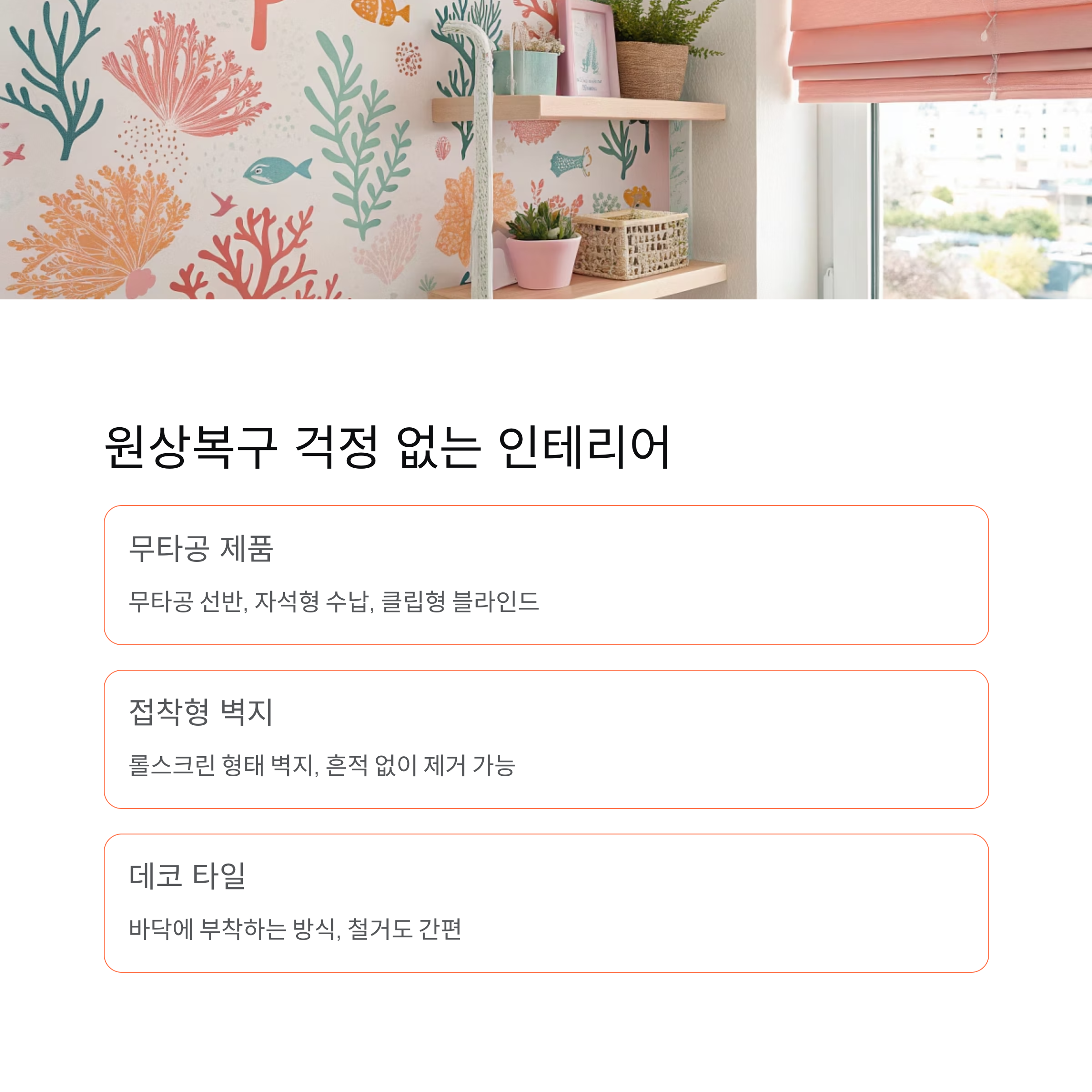 인테리어를 하더라도 되도록 간편하고 가벼운 방법으로, 혹은 철거가 쉬운 자재나 아이템을 사용하는 걸 추천해요. 자기만의 감성 공간을 만들되, 책임은 최소화해야 하니까요!