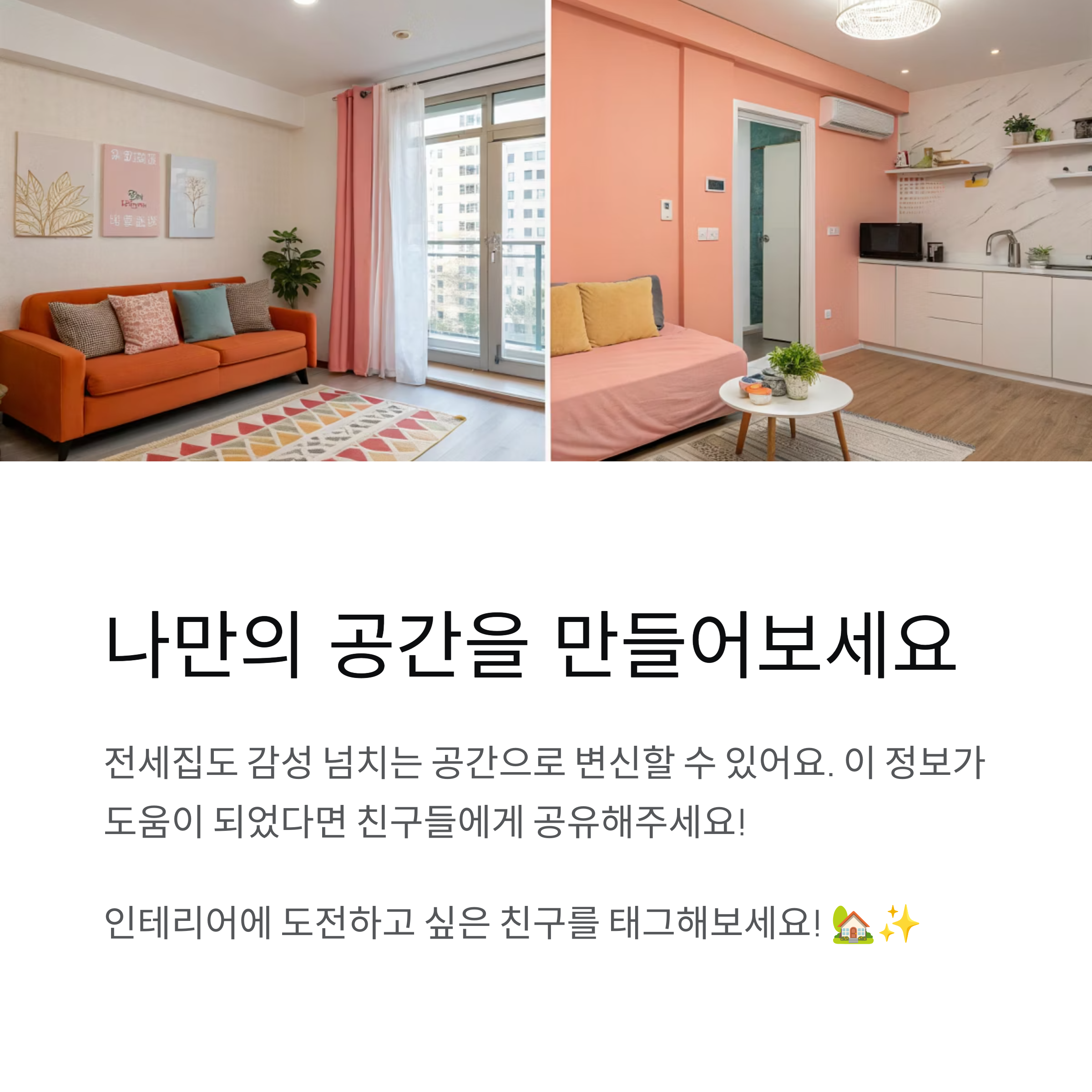 전세집이라도 할 수 있는 건 정말 많아요! 커튼이나 러그 바꾸기만 해도 분위기가 확 달라지고, 스티커 타일이나 패브릭 포스터만으로도 감성 충만한 집이 된답니다. 🪴