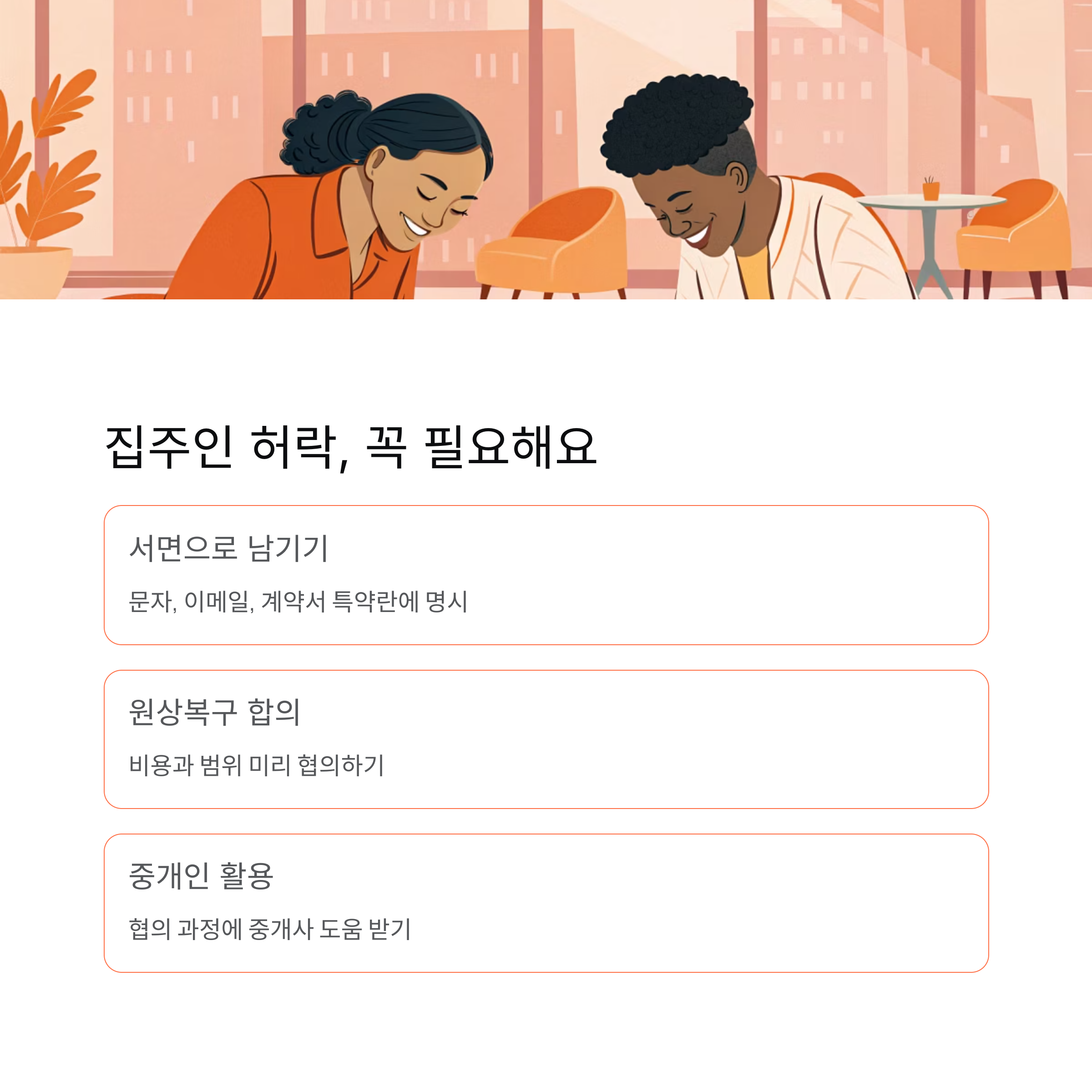 허락을 받을 때는 구두가 아닌 서면으로 증거를 남기는 것이 좋아요. 문자, 이메일, 혹은 계약서 특약란에 직접 명시해 두면 나중에 원상복구 관련 분쟁에서 훨씬 유리하답니다. 계약서 외에 별도 동의서를 받는 것도 추천해요.