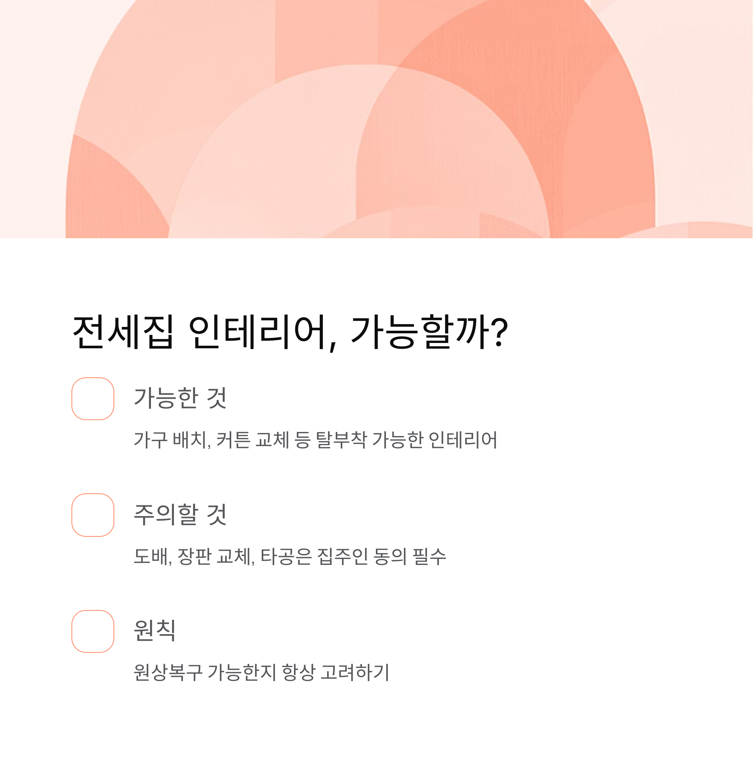 전세집도 인테리어가 가능해요. 다만 ‘어떤 범위까지 가능한가?’가 중요하답니다. 기본적으로 ‘가구 배치’나 ‘커튼 교체’ 등 탈부착이 가능한 인테리어는 전혀 문제가 없어요. 하지만 도배, 장판 교체, 타공(벽 뚫기), 구조 변경 등은 반드시 집주인의 동의를 받아야 해요.