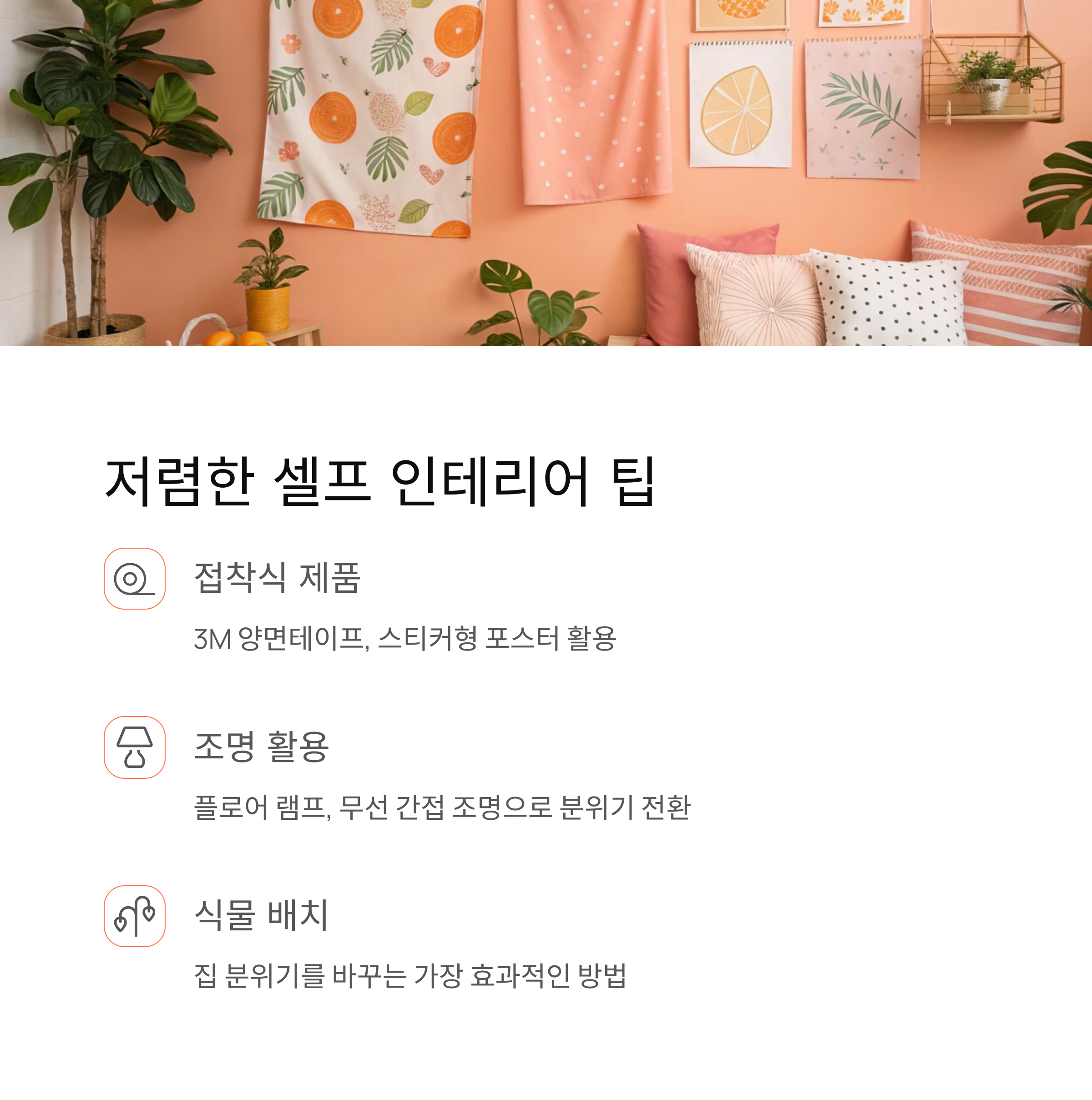 소소한 변화를 원한다면 쿠션, 커버, 식물, 장식 오브제로 꾸며보세요. 특히 식물은 집 분위기를 바꾸는 데 가장 효과적인 아이템이에요. 🌿
