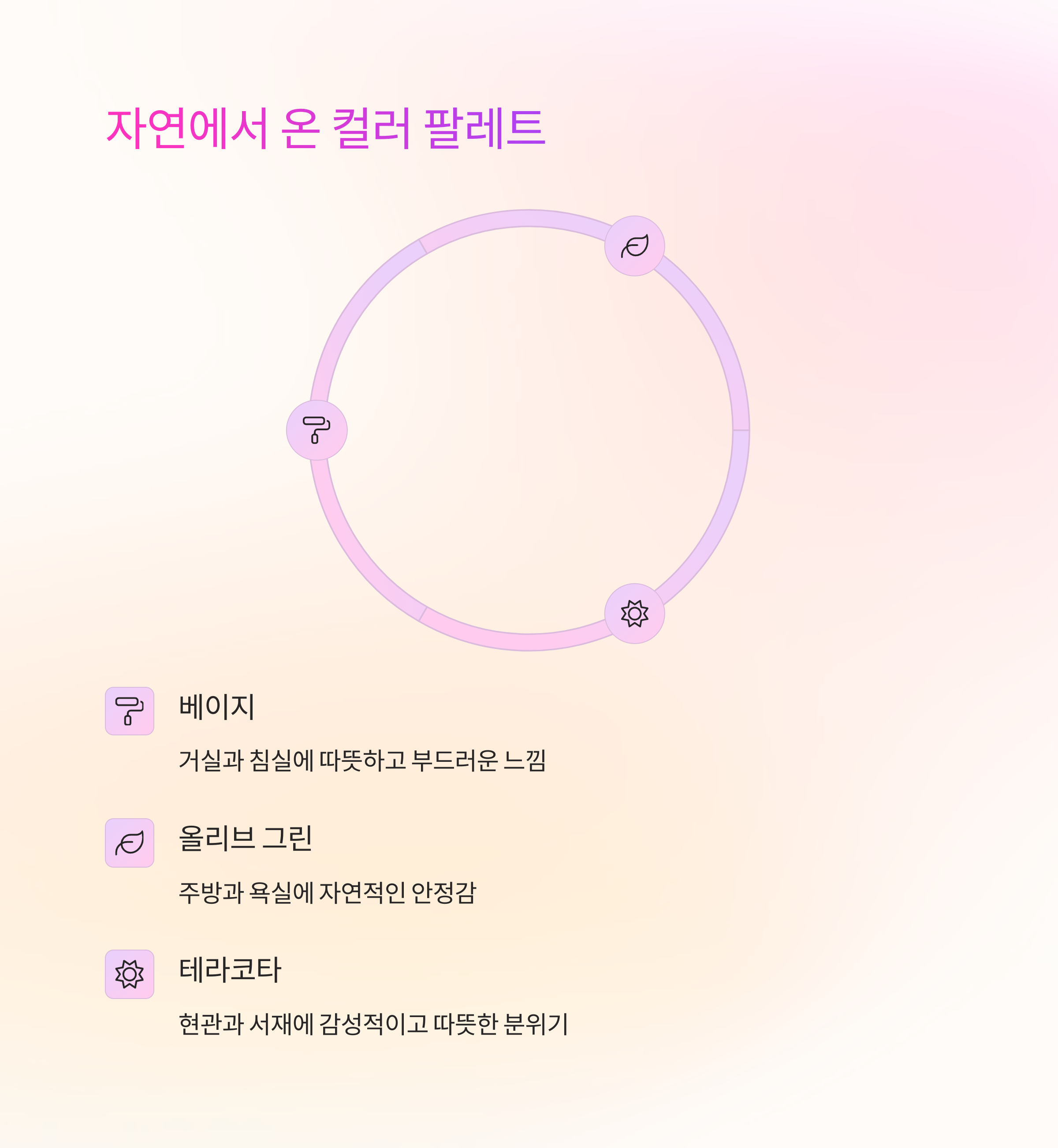 | 베이지 | 따뜻하고 부드러움 | 거실, 침실 |