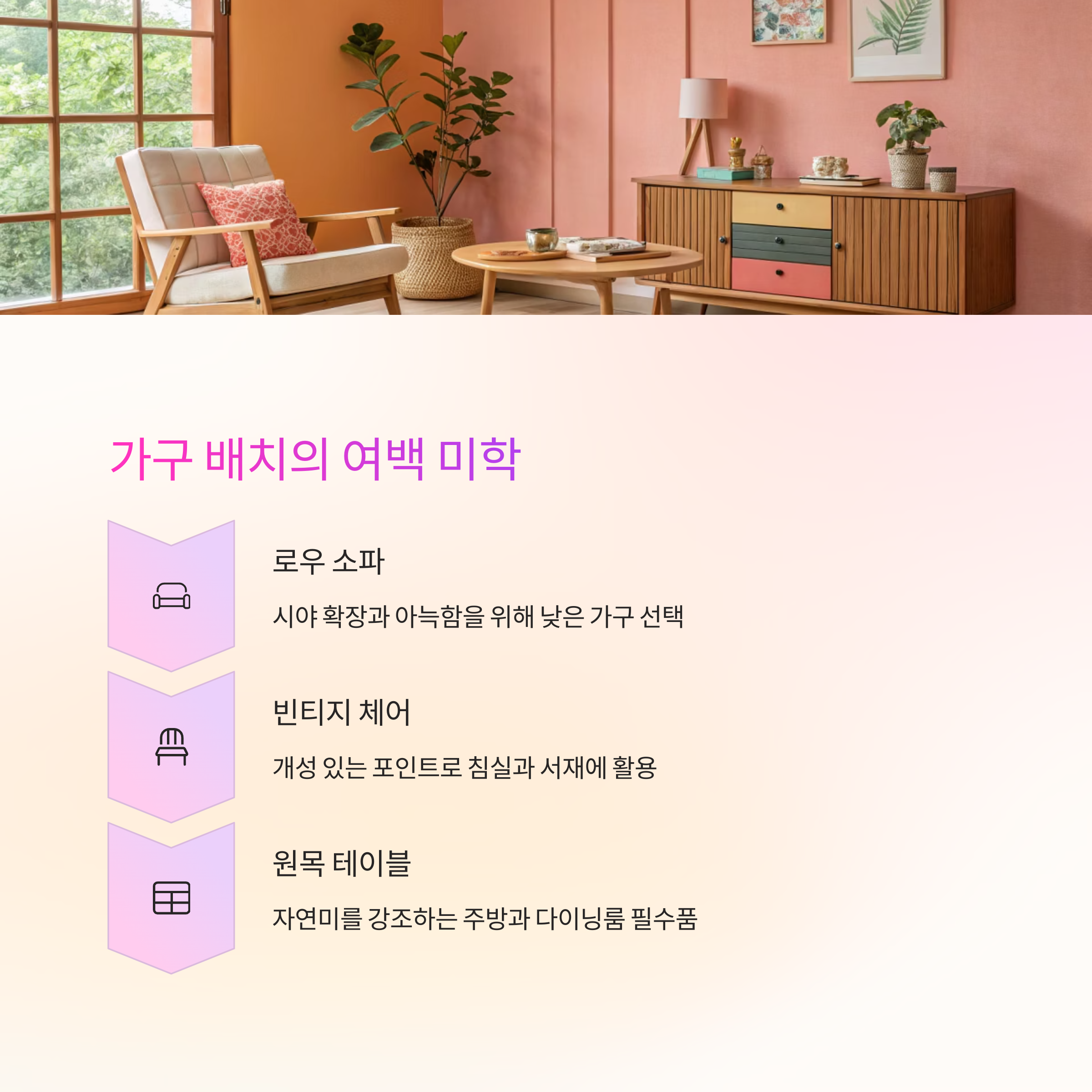 | 로우 소파 | 시야 확장, 아늑함 | 거실 |