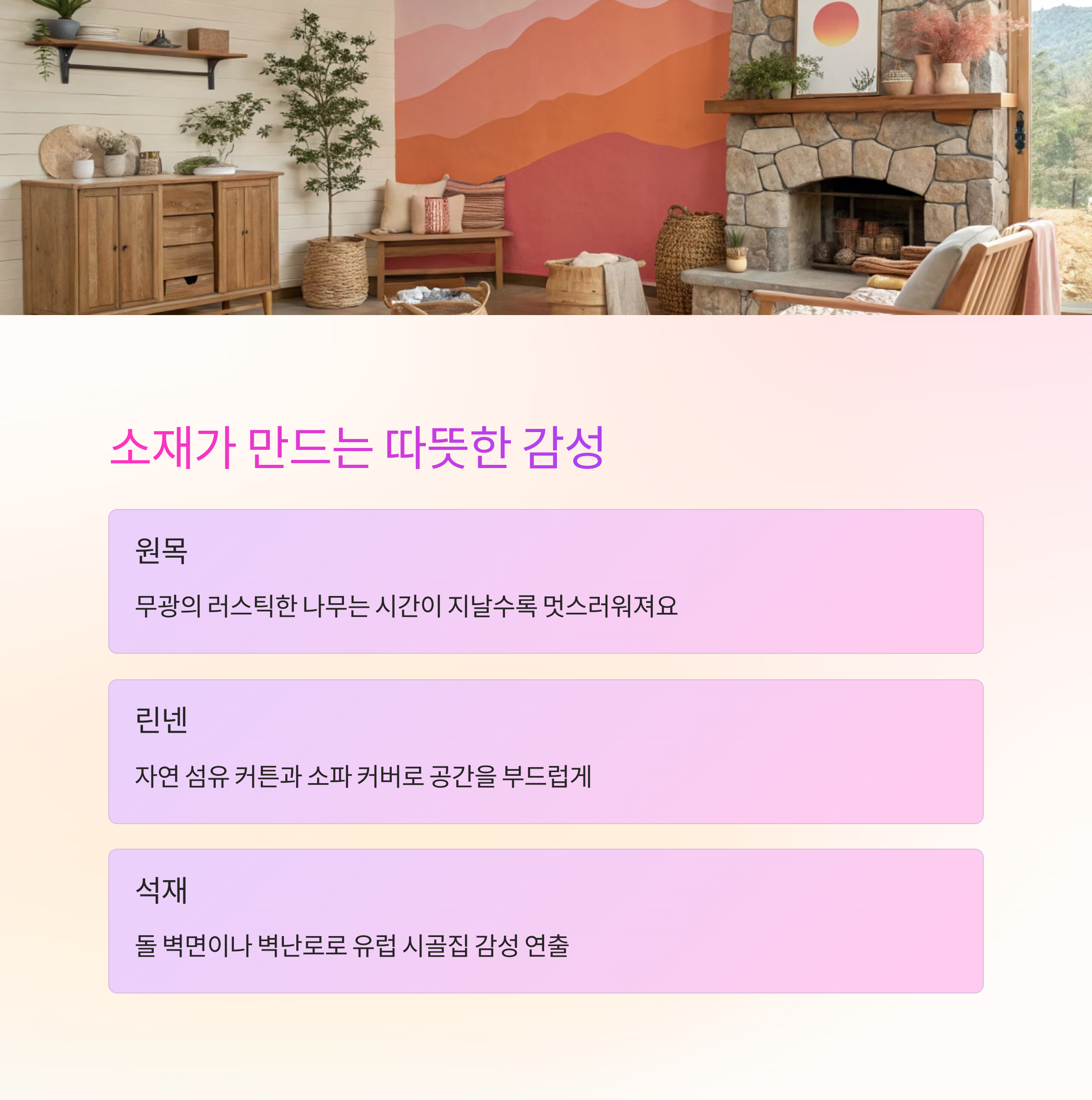 소재를 고를 때는 디자인보다 먼저 ‘느낌’을 고려해보세요. 감성은 결국 우리가 공간에서 무엇을 느끼느냐에 따라 결정되니까요 😊