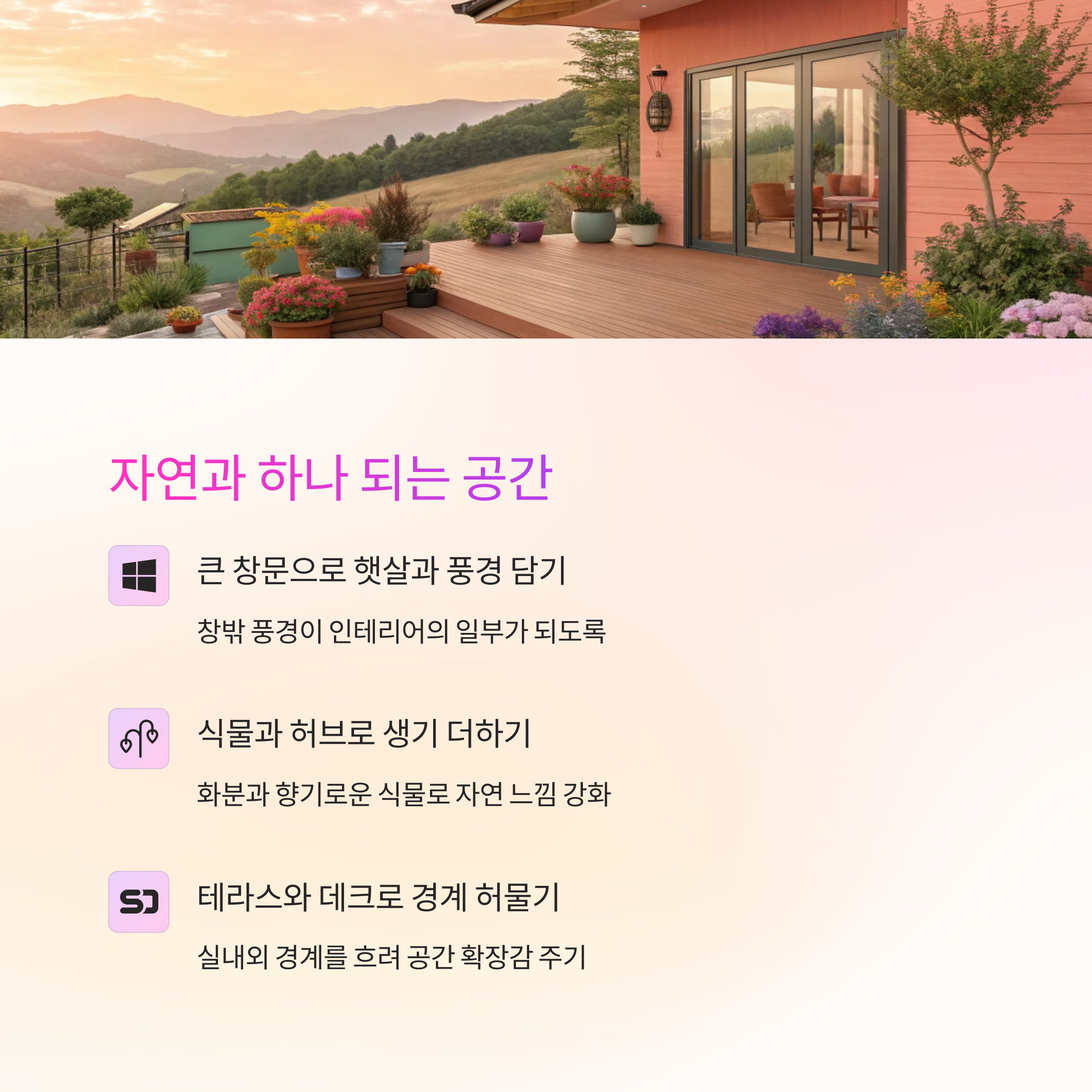 전원주택의 가장 큰 장점은 바로 자연과 가까운 환경이에요. 그렇기 때문에 인테리어 역시 자연과 조화를 이루는 것이 중요해요. 큰 창문을 두어 햇살과 바람이 집 안 깊숙이 들어오도록 설계하고, 창밖 풍경이 그대로 인테리어의 일부가 될 수 있도록 배치해요.