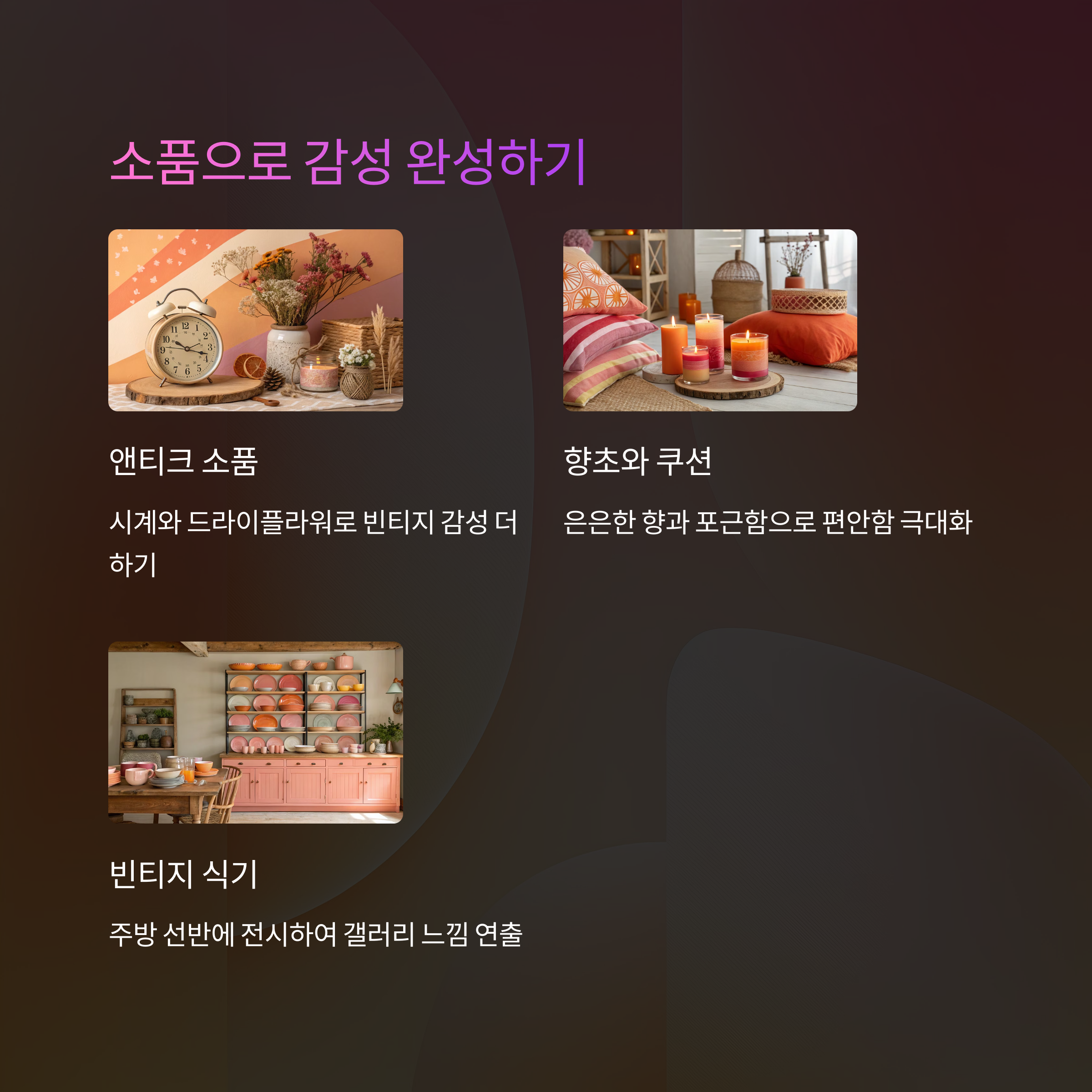 주방에는 빈티지 접시와 찻잔을 선반 위에 전시해두면 갤러리 느낌도 나고, 일상에서도 작은 즐거움을 느낄 수 있어요. 공간마다 콘셉트를 정해 소품을 선택하면 더 일관된 분위기가 나요.