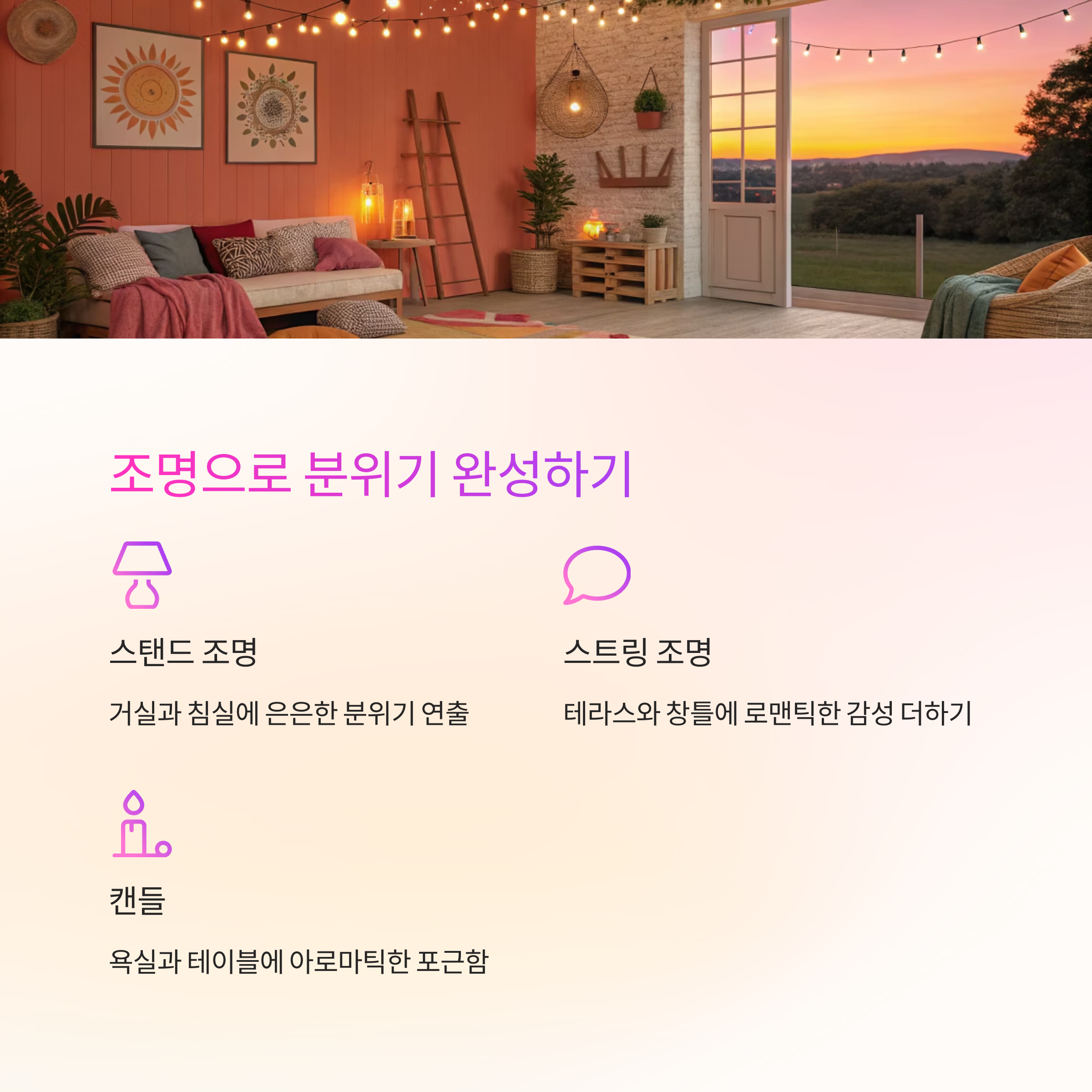 캔들라이트나 전구 모양 스트링 조명은 데코 소품으로도 훌륭해요. 야외 테라스나 창틀에 살짝 걸어주면 집 안이 바로 감성 캠핑장이 되는 느낌이에요 🕯️