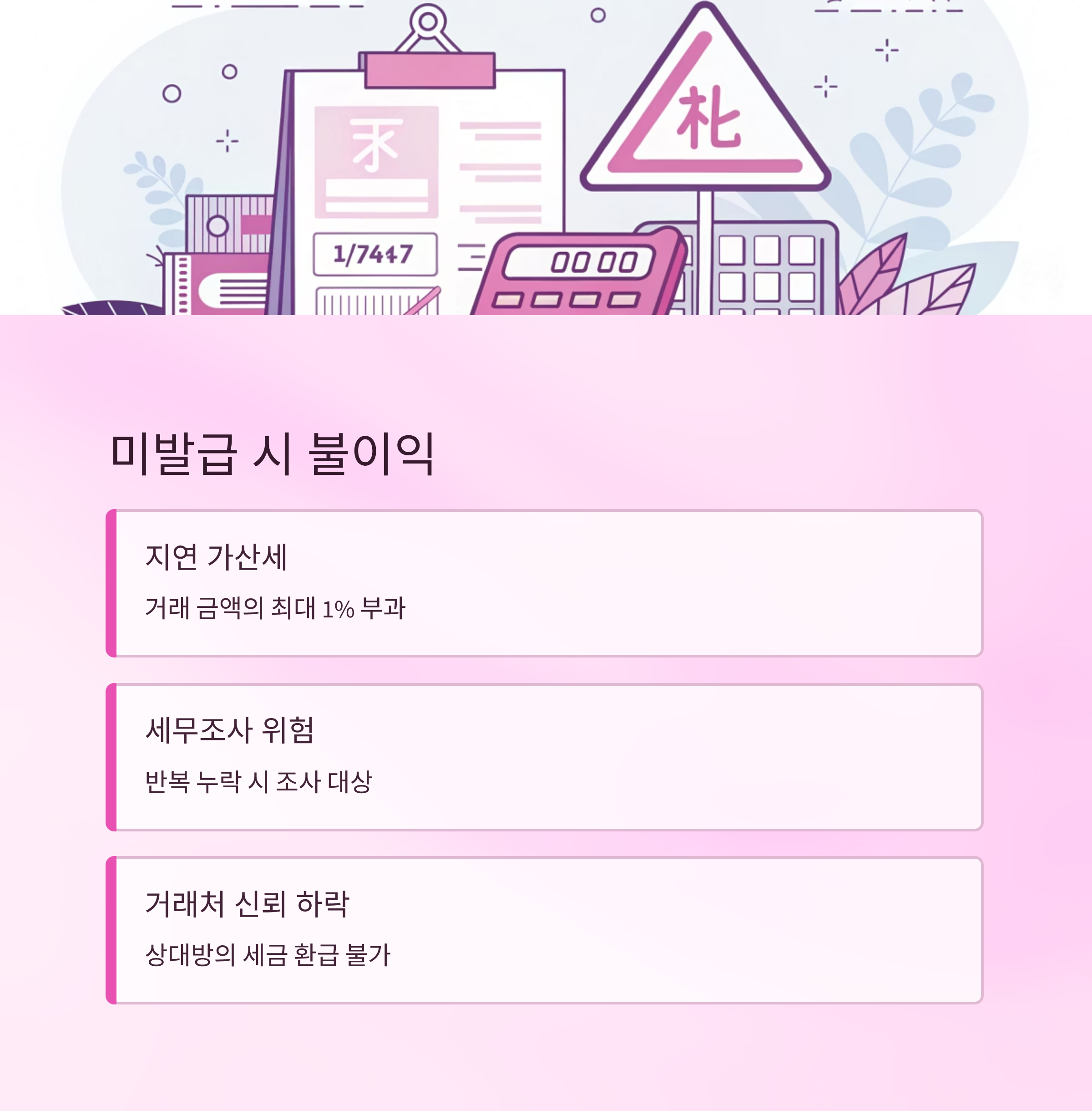 거래처와의 신뢰 문제도 있어요. 상대방이 부가세 환급을 받기 위해선 세금계산서가 반드시 필요하거든요. 발급을 제때 하지 않으면 거래처에서 불만을 가질 수 있고, 계약이 끊어질 수도 있어요. 결국은 내 사업의 신뢰도 문제로까지 이어질 수 있어요.