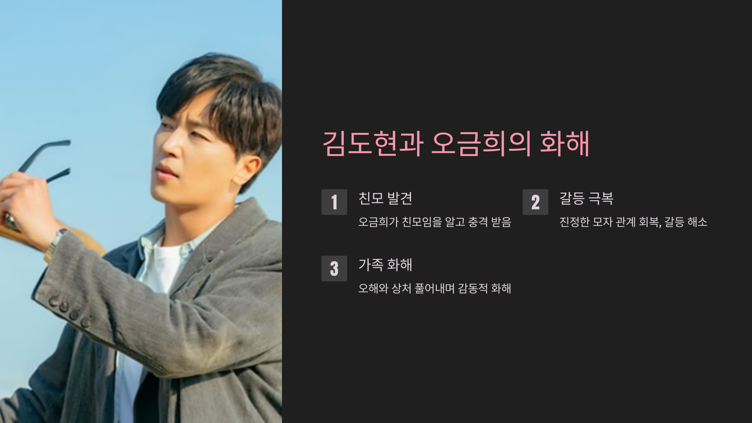 김도현은 오랜 시간 동안 찾아 헤매던 친모가 오금희라는 사실을 알게 되면서 큰 충격을 받았습니다. 그러나 두 사람은 진정한 모자 관계를 회복하며 갈등을 극복했습니다. 오랜 오해와 상처를 풀어내는 이 장면은 가족 간의 화해와 용서라는 주제를 감동적으로 담아냈으며, 드라마의 클라이맥스를 장식했습니다. 이는 가족이라는 관계가 어떤 어려움 속에서도 다시 회복될 수 있음을 보여주는 의미 있는 메시지였습니다.