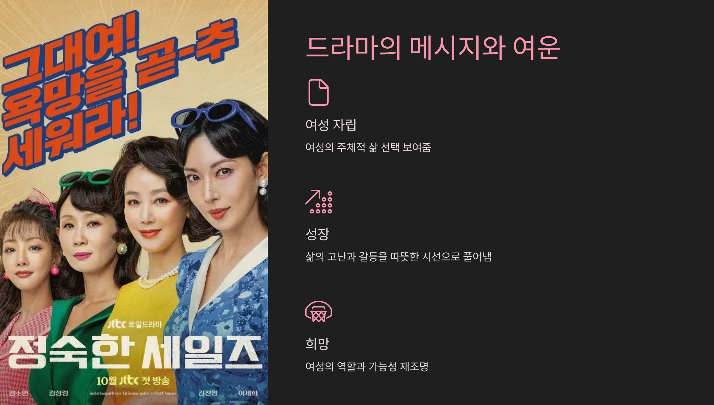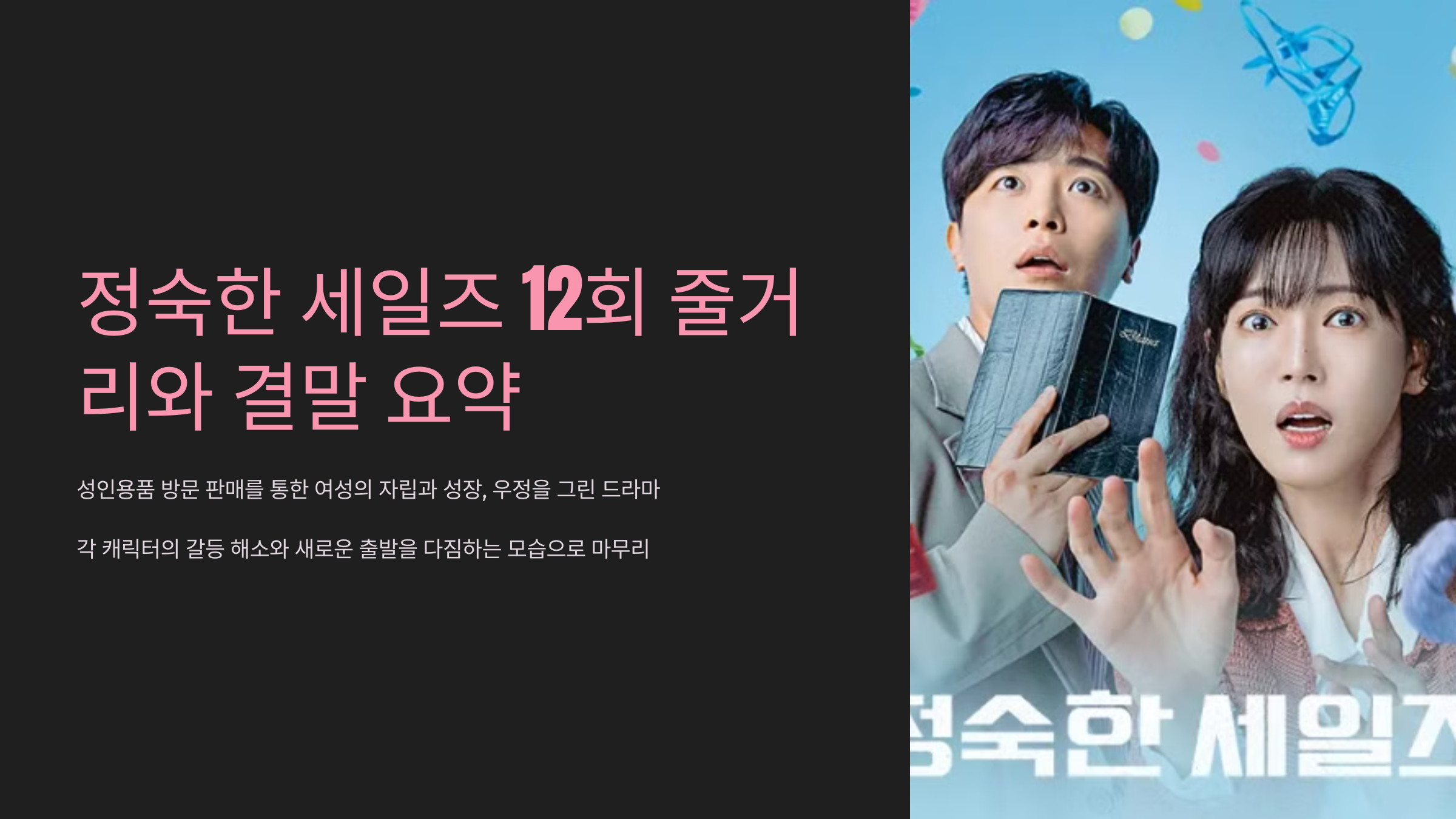 JTBC 드라마 "정숙한 세일즈"는 기존 드라마에서는 쉽게 다루지 않는 성인용품 방문 판매라는 신선한 소재를 중심으로, 여성의 자립과 성장, 우정을 따뜻하게 그려낸 작품입니다. 12회로 완결된 이 드라마는 각 캐릭터의 갈등이 해소되고, 그들이 새로운 출발을 다짐하는 모습으로 마무리되며, 시청자들에게 잔잔한 감동과 진한 여운을 남겼습니다. 이 글에서는 마지막 회의 주요 줄거리와 결말, 드라마가 담고 있는 메시지와 여운에 대해 자세히 살펴보겠습니다.