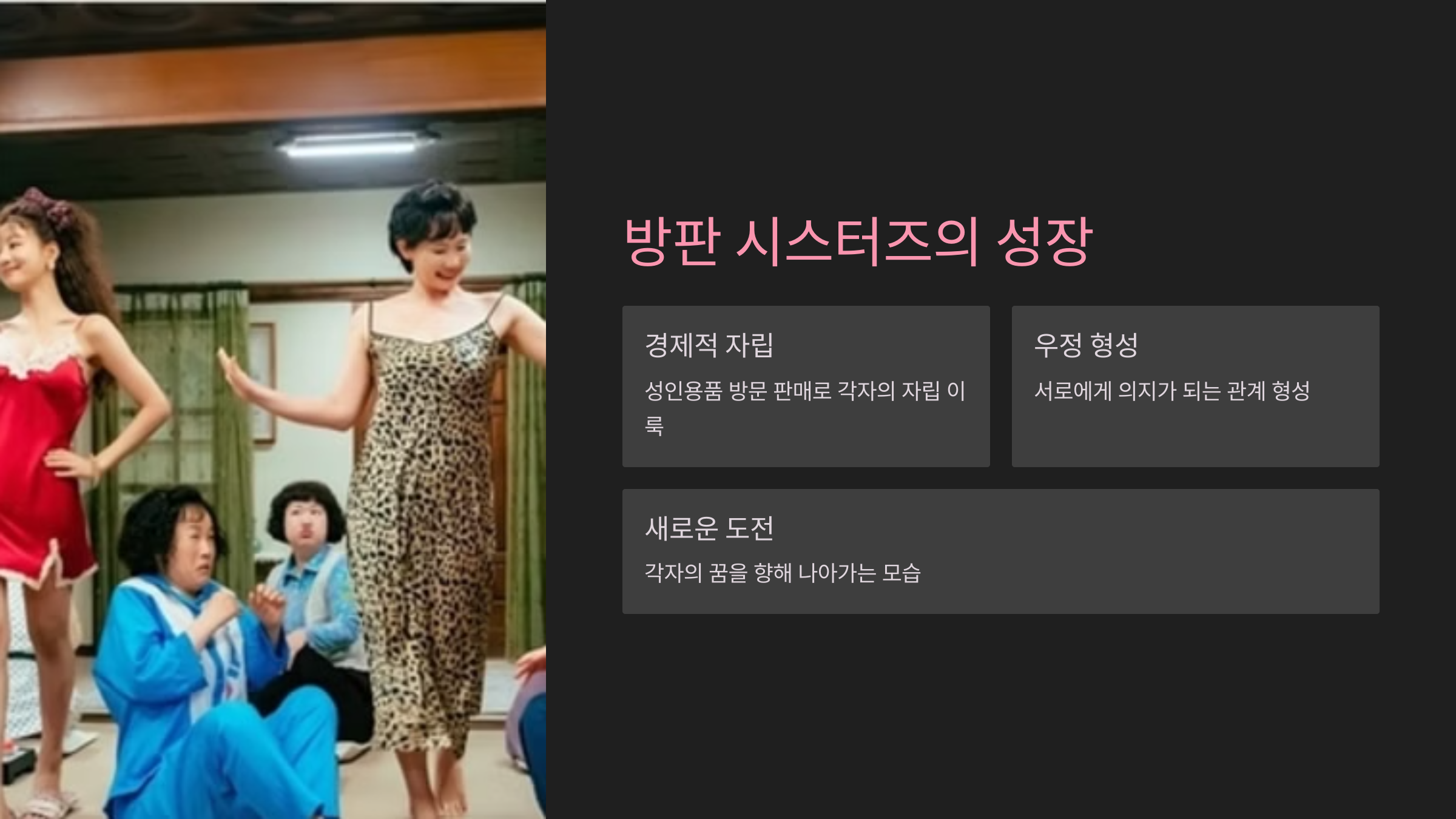 ‘방판 시스터즈’로 불리는 한정숙, 오금희, 서영복, 이주리는 성인용품 방문 판매라는 독특한 일을 통해 각자의 자립을 이룩하며 서로에게 의지가 되는 관계를 형성했습니다. 마지막 회에서는 이들 모두가 자신의 삶에서 새로운 도전을 시작하는 모습이 그려졌습니다. 한정숙은 성인용품 사업을 지속하며 다른 여성들의 자립을 돕는 역할을 맡았고, 나머지 멤버들 역시 각자의 꿈을 향해 나아갔습니다. 이들의 여정은 경제적 자립과 우정을 통해 삶의 어려움을 극복할 수 있다는 메시지를 담고 있었습니다.