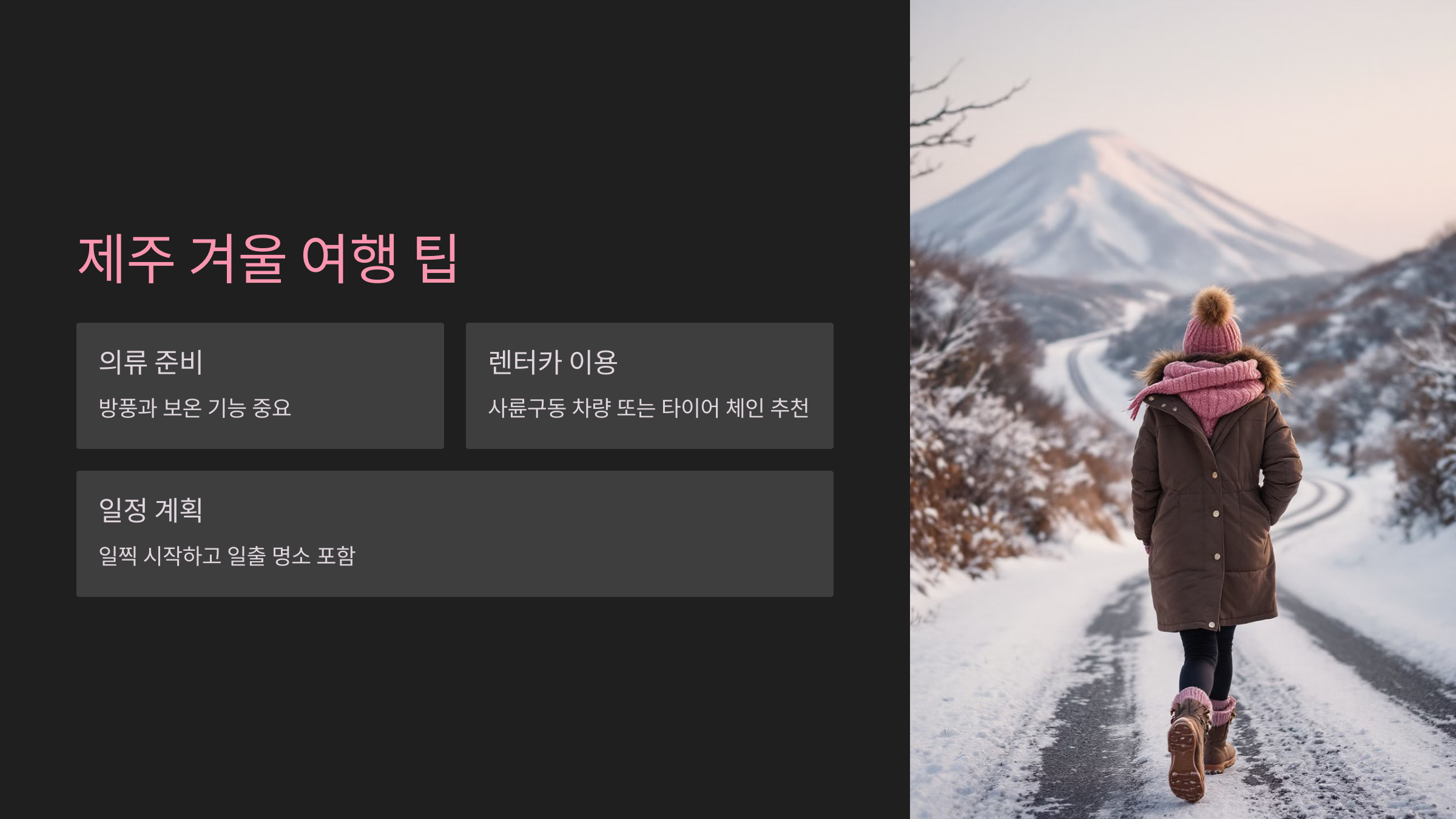 - 일정 계획: 겨울에는 해가 일찍 지기 때문에 일정을 오전부터 시작하고, 일출 명소를 포함하면 알찬 여행이 가능합니다.