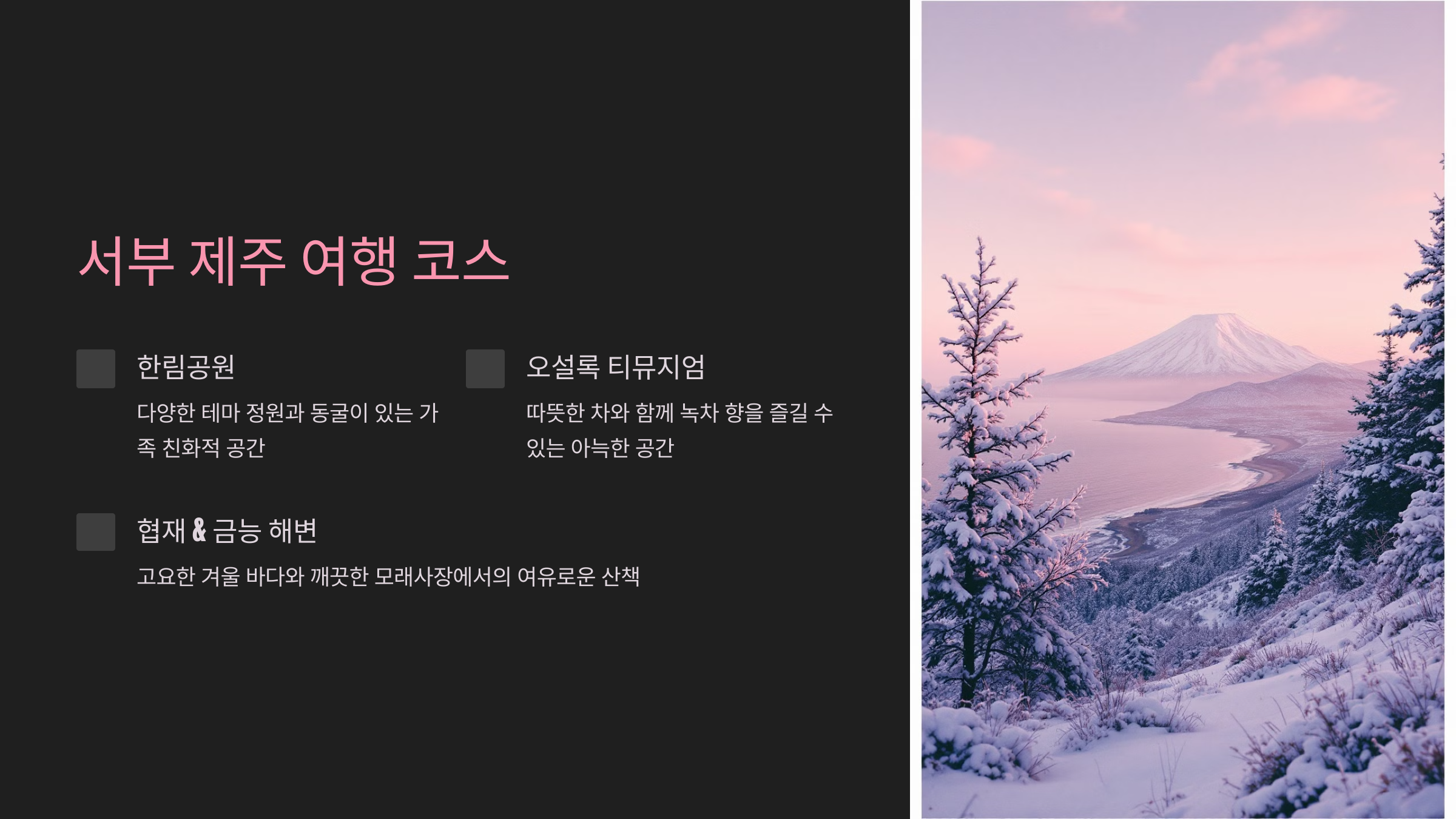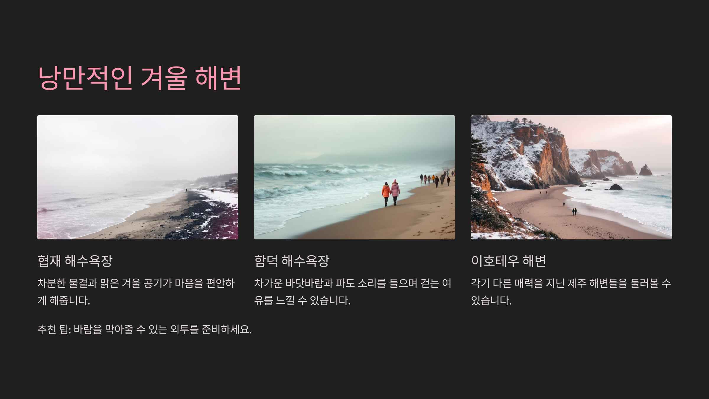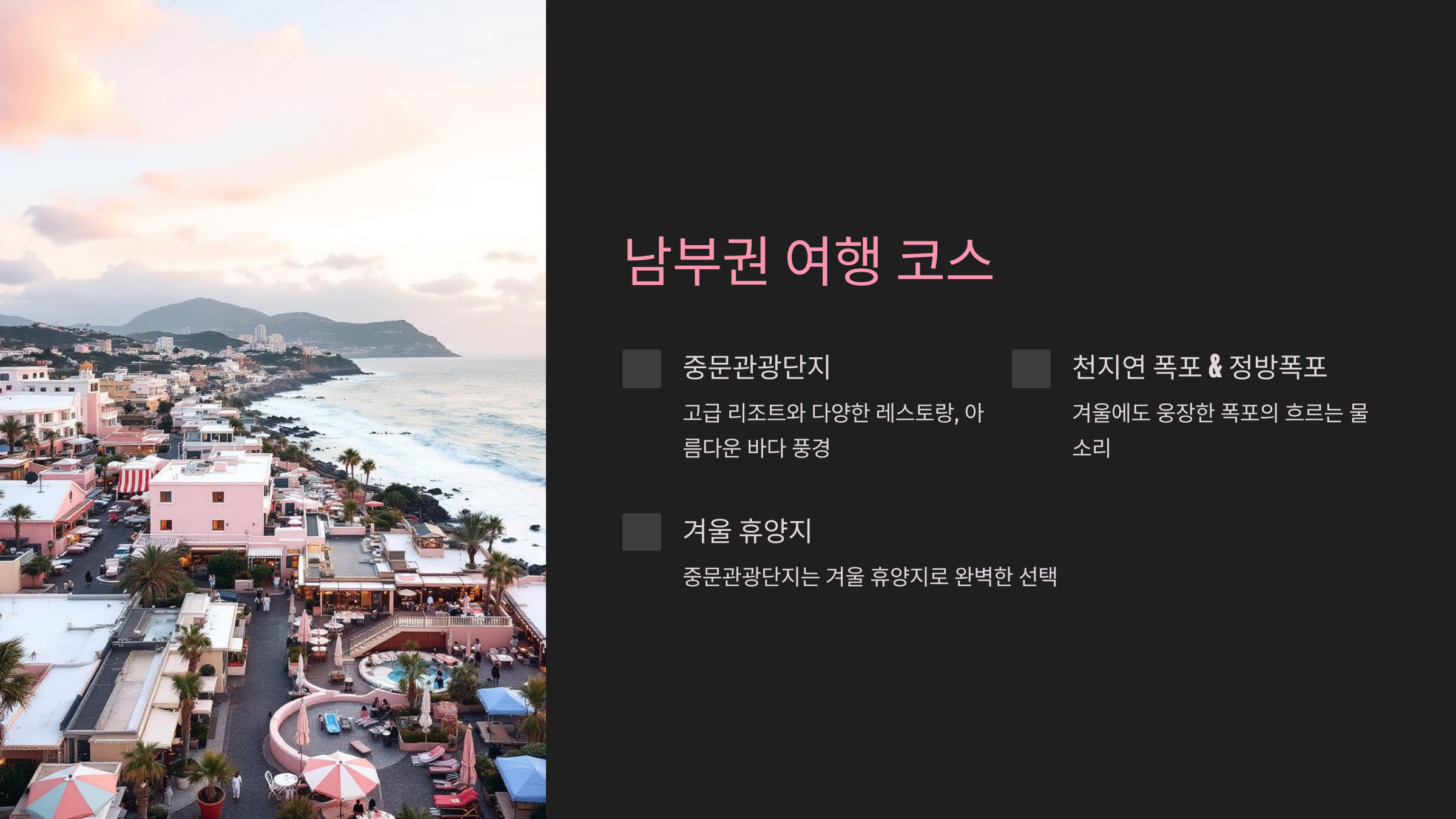 - 중문관광단지: 고급 리조트와 다양한 레스토랑, 아름다운 바다 풍경이 어우러져 겨울 휴양지로 완벽한 선택입니다.