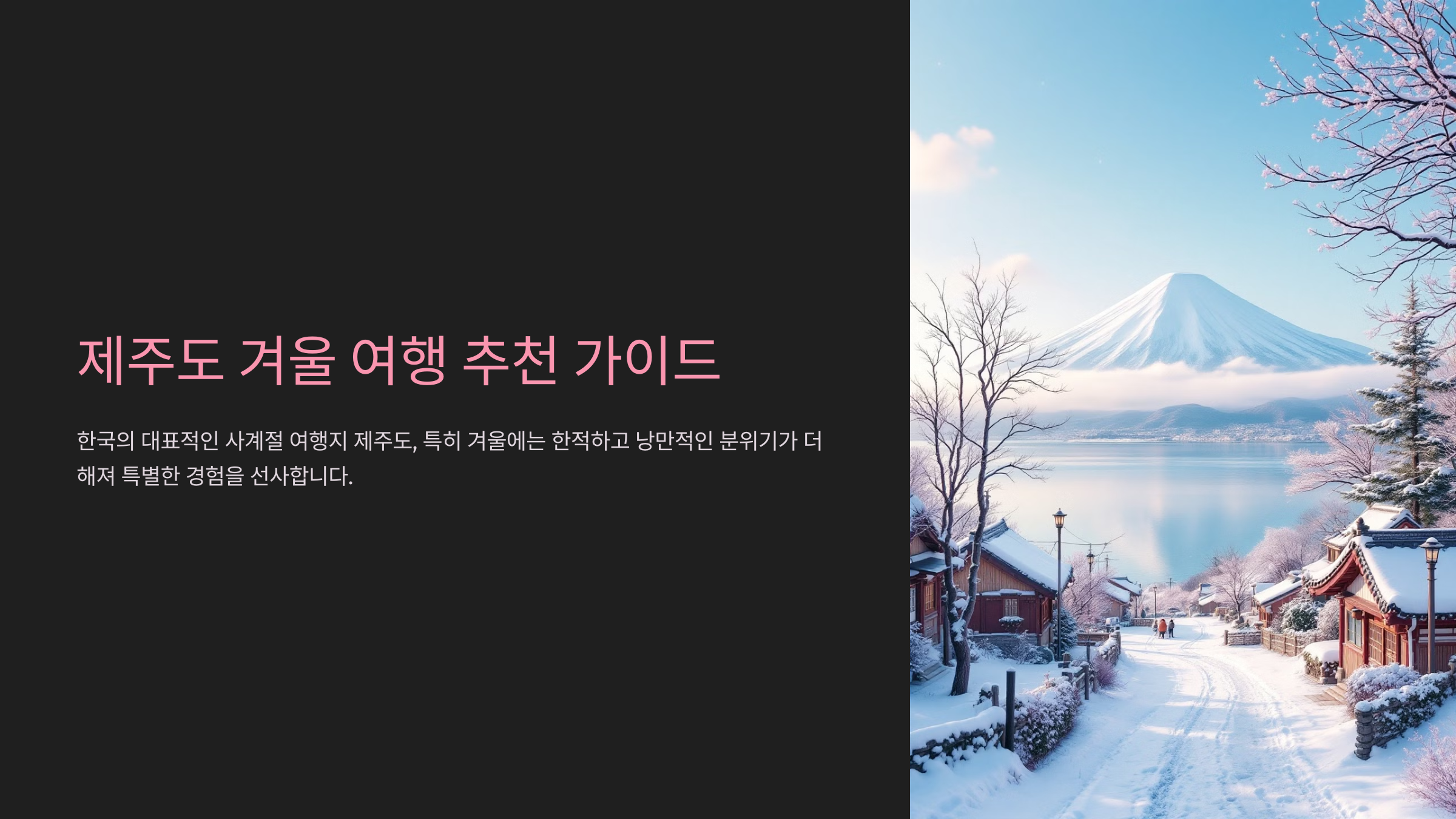 제주도는 한국의 대표적인 사계절 여행지로, 특히 겨울에는 한적하고 낭만적인 분위기가 더해져 더욱 특별한 경험을 선사합니다. 온화한 기후로 한국의 다른 지역보다 따뜻한 날씨를 자랑하며, 한라산의 눈꽃, 고요한 겨울바다, 독특한 오름, 그리고 겨울철의 지역 특산 요리 등 다채로운 매력을 제공합니다. 이 가이드를 통해 제주도의 겨울 여행 매력을 깊이 알아보고, 꼭 방문해야 할 명소와 즐길 거리를 확인해 보세요.