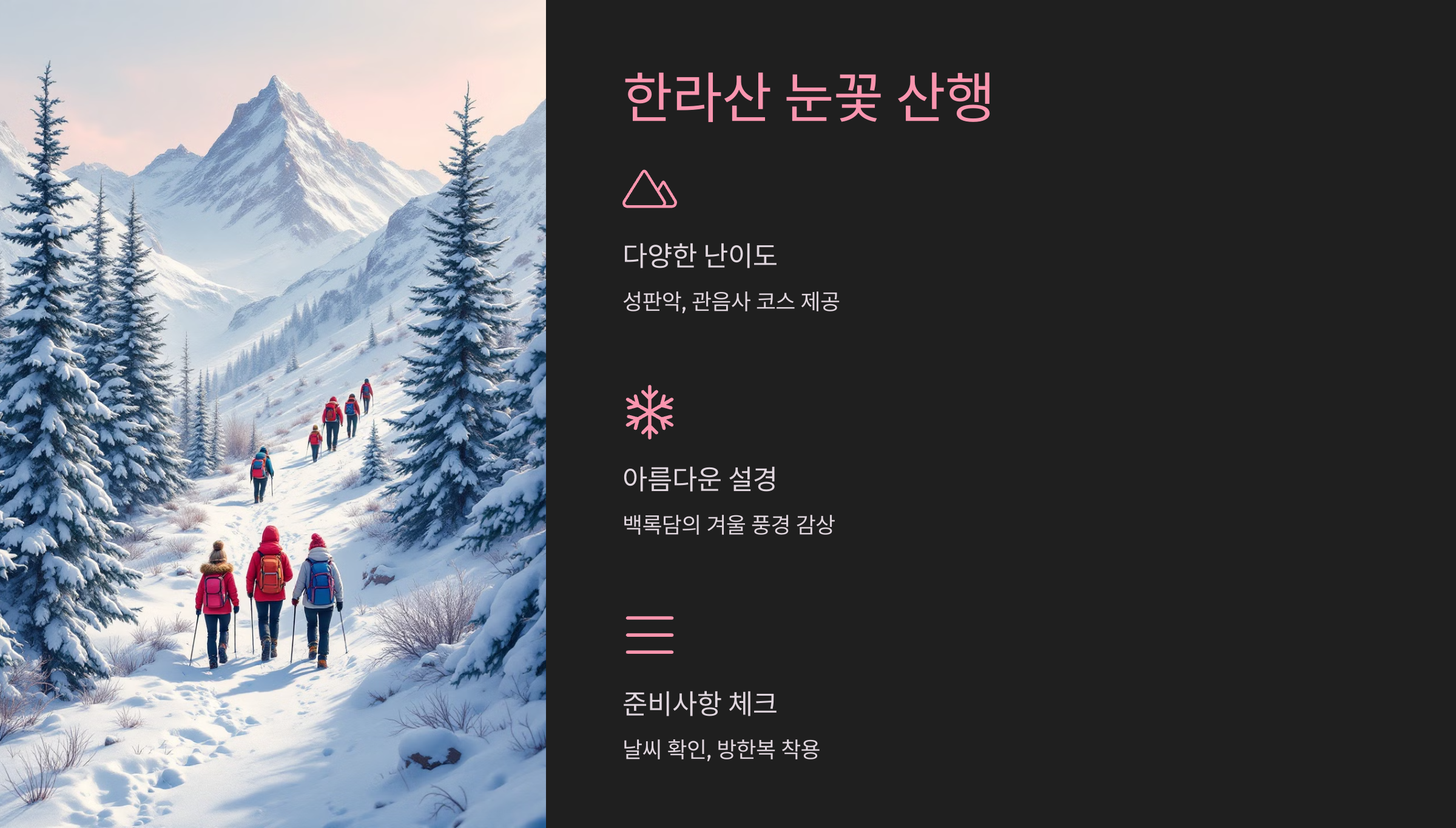 추천 포인트: 눈꽃이 만발한 한라산의 겨울 풍경은 사진으로는 다 담을 수 없는 감동을 선사합니다. 눈 속을 걸으며 느껴지는 고요함은 특별한 힐링 경험을 제공합니다.