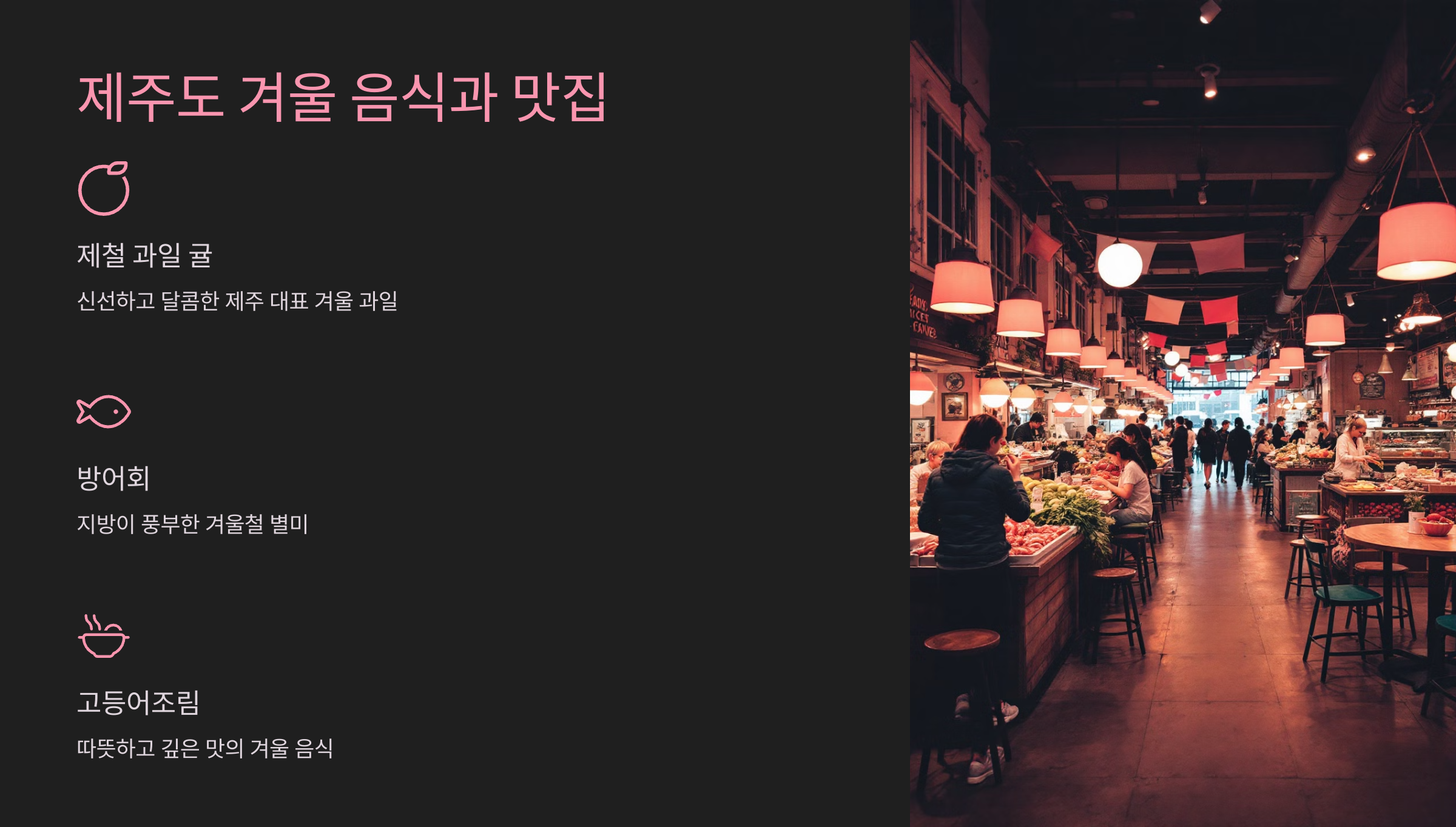 - 귤: 제주도의 대표 겨울 과일인 귤은 신선하고 달콤하며, 귤 따기 체험도 가능합니다.