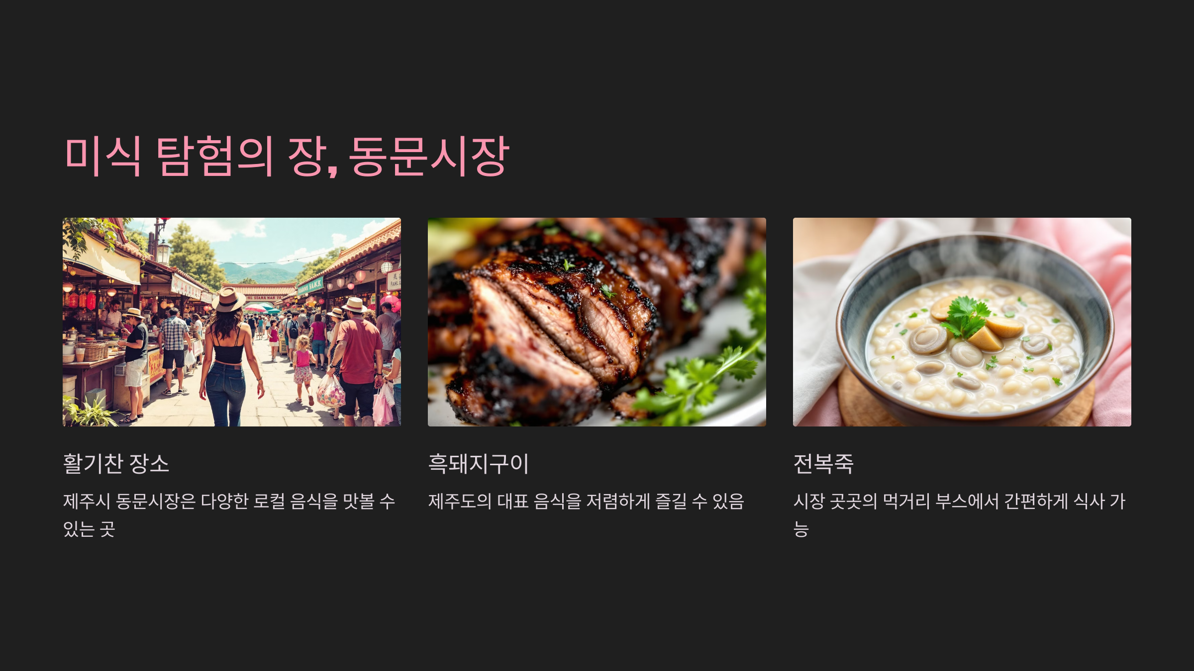 제주시 동문시장은 다양한 로컬 음식을 맛볼 수 있는 활기찬 장소로, 혼자서도 부담 없이 방문할 수 있습니다. 흑돼지구이, 고기국수, 전복죽 등 제주도의 맛을 저렴하게 즐길 수 있으며, 시장 곳곳에 있는 먹거리 부스에서 간편하게 식사를 해결할 수 있습니다.