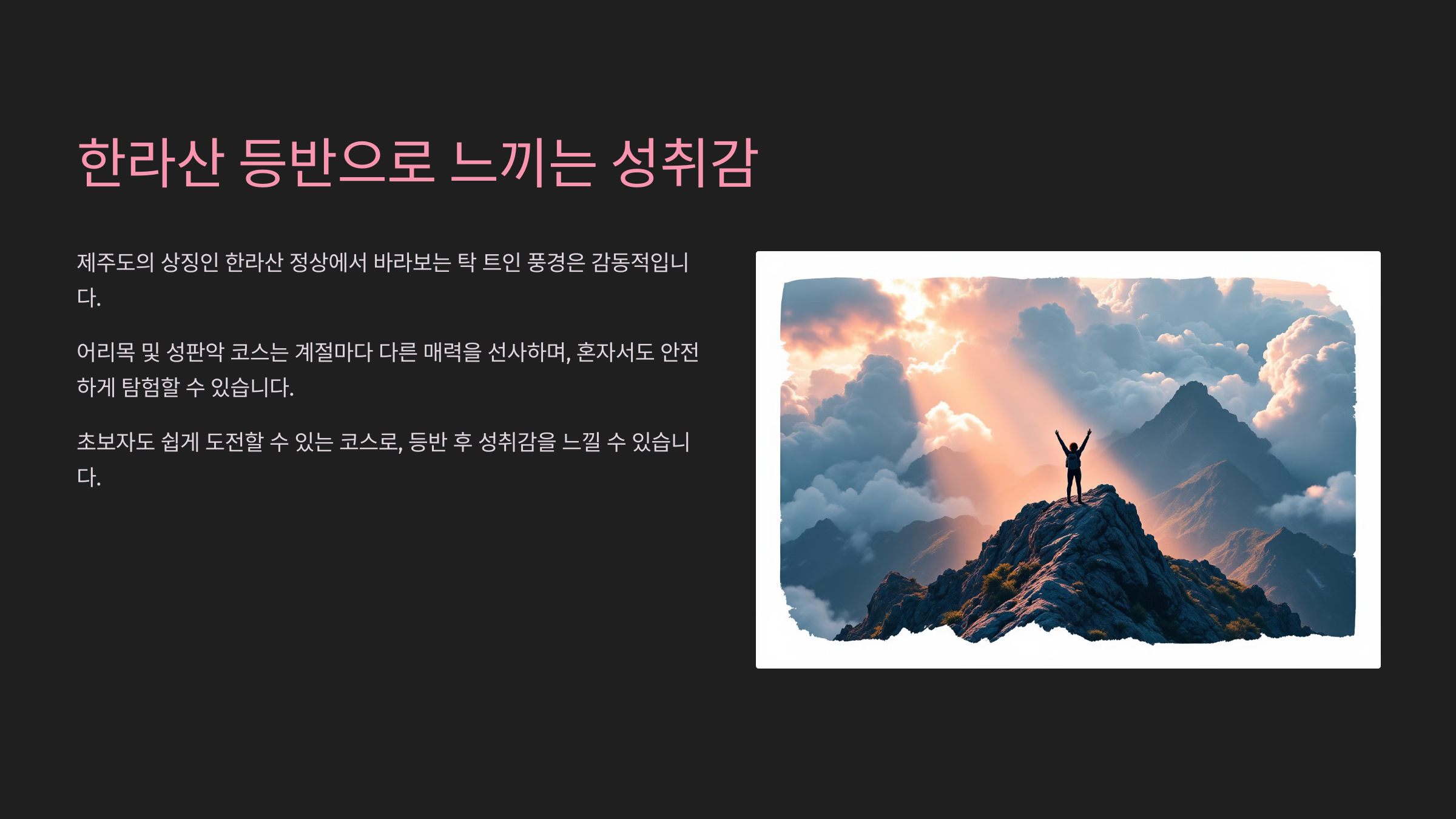 한라산은 제주도의 상징으로, 등반 후 정상에서의 탁 트인 풍경은 말로 표현할 수 없는 감동을 선사합니다. 초보자도 쉽게 도전할 수 있는 어리목 코스와 성판악 코스는 계절마다 다른 매력을 뽐내며, 혼자서도 안전하게 탐험할 수 있는 환경을 제공합니다.