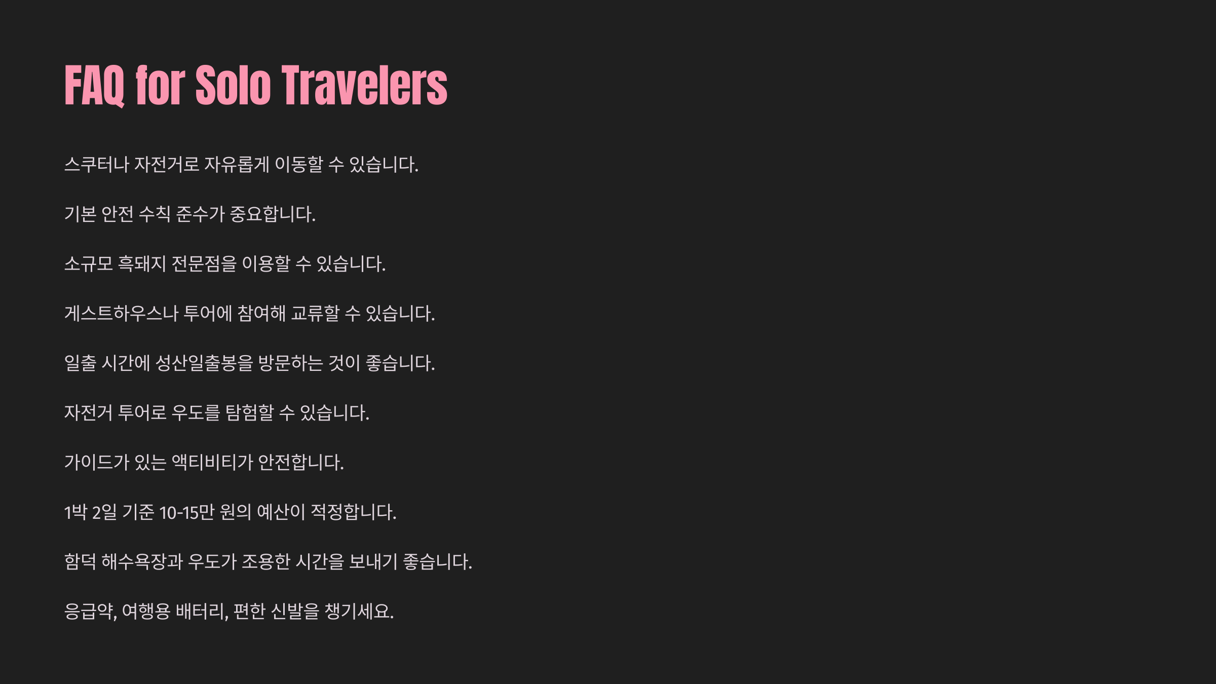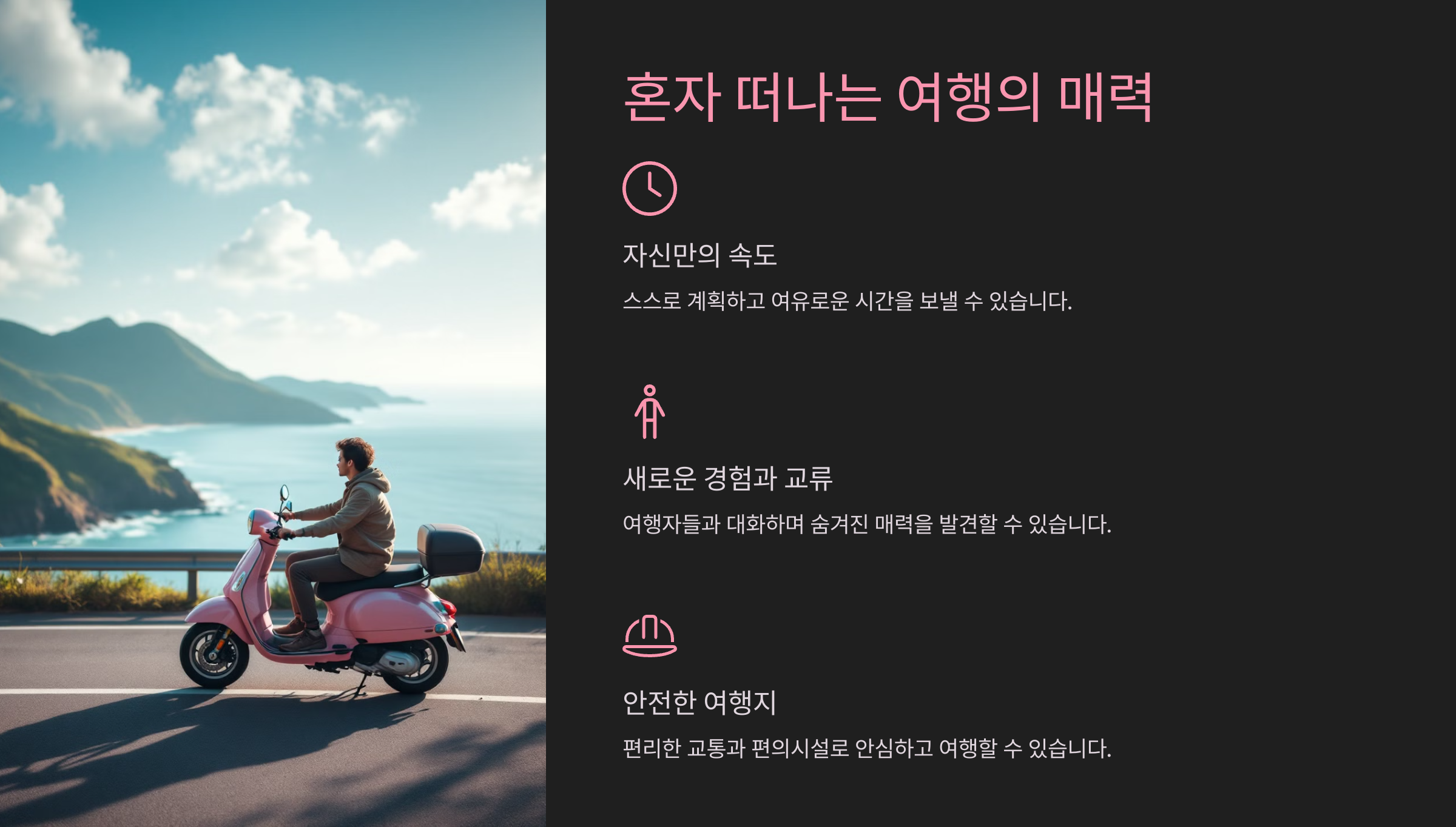 혼자 떠나는 여행의 가장 큰 장점은 스스로 모든 것을 계획하고 조율할 수 있다는 점입니다. 복잡한 도시 생활에서 벗어나 조용한 자연 속에서 여유로운 시간을 보내거나, 스쿠터를 빌려 제주도의 아름다운 도로를 달리며 바람을 느낄 수 있습니다. 일정이 빡빡하지 않아 원하는 만큼 쉬고 탐험할 수 있어 진정한 자유를 만끽할 수 있습니다.