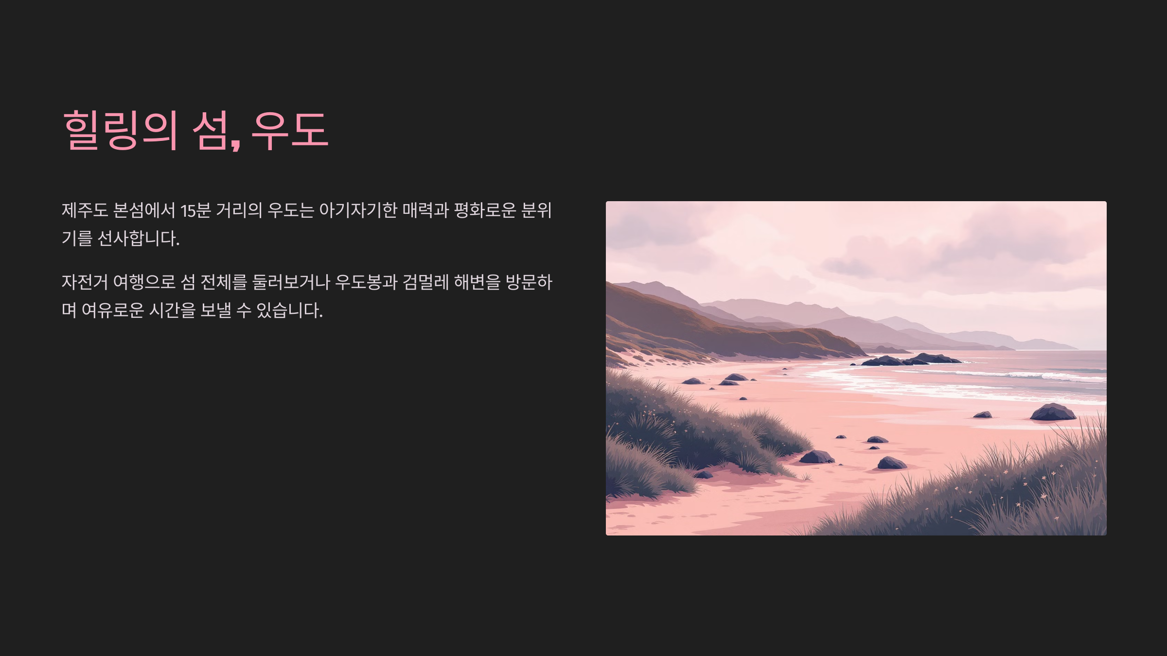 제주도 본섬에서 배로 약 15분 거리에 있는 우도는 아기자기한 매력과 평화로운 분위기를 동시에 느낄 수 있는 장소입니다. 자전거를 빌려 섬 전체를 일주하거나, 우도봉과 검멀레 해변을 방문하며 여유로운 시간을 보낼 수 있습니다. 우도만의 독특한 자연경관은 혼자 시간을 보내기에도 완벽한 배경을 제공합니다.