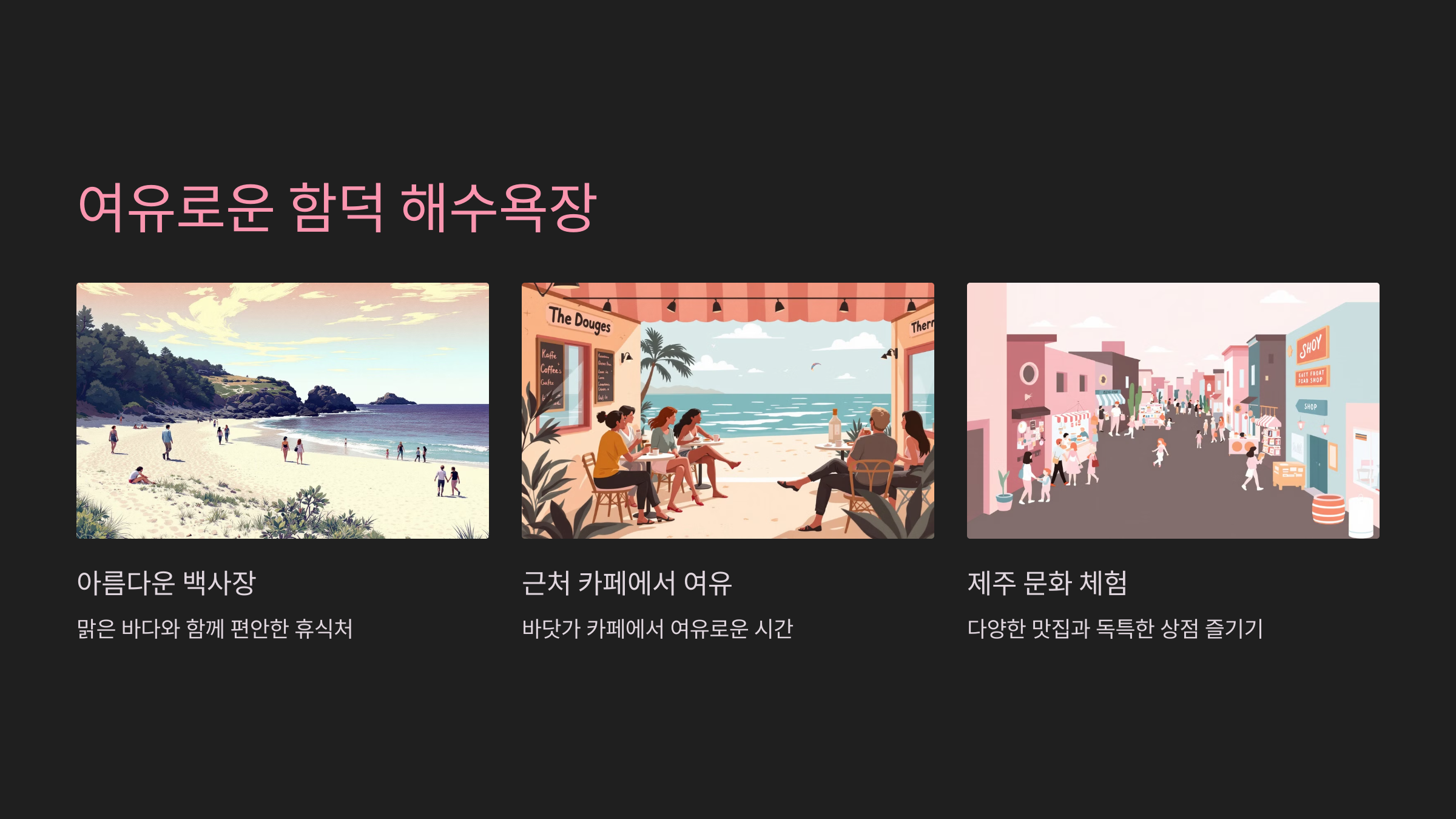함덕 해수욕장은 아름다운 백사장과 맑은 바다를 자랑하며, 혼자 여행자들에게도 좋은 휴식처입니다. 바닷가를 따라 산책하거나, 해변 근처 카페에서 커피를 마시며 느긋한 하루를 보낼 수 있습니다. 근처에 다양한 맛집과 독특한 상점들이 있어 혼자서도 제주도의 맛과 문화를 충분히 즐길 수 있습니다.