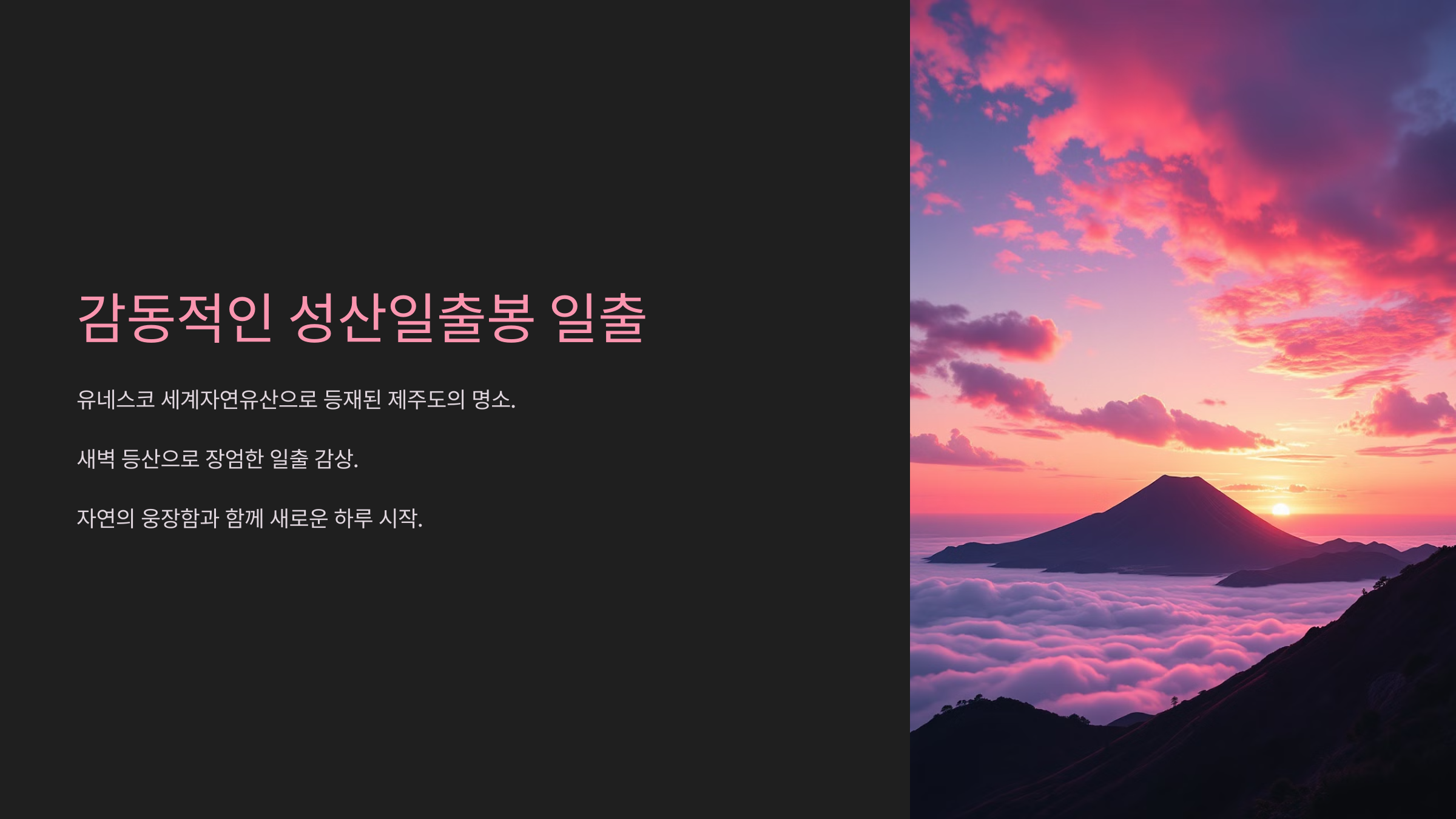 성산일출봉은 유네스코 세계자연유산으로 등재된 제주도의 대표적인 명소입니다. 새벽 시간에 등산하여 일출을 감상하면 자연의 웅장함과 함께 새로운 하루를 시작할 수 있습니다. 태양이 떠오르며 만들어내는 장엄한 풍경은 혼자 여행 중에도 가슴 벅찬 순간을 선사합니다.
