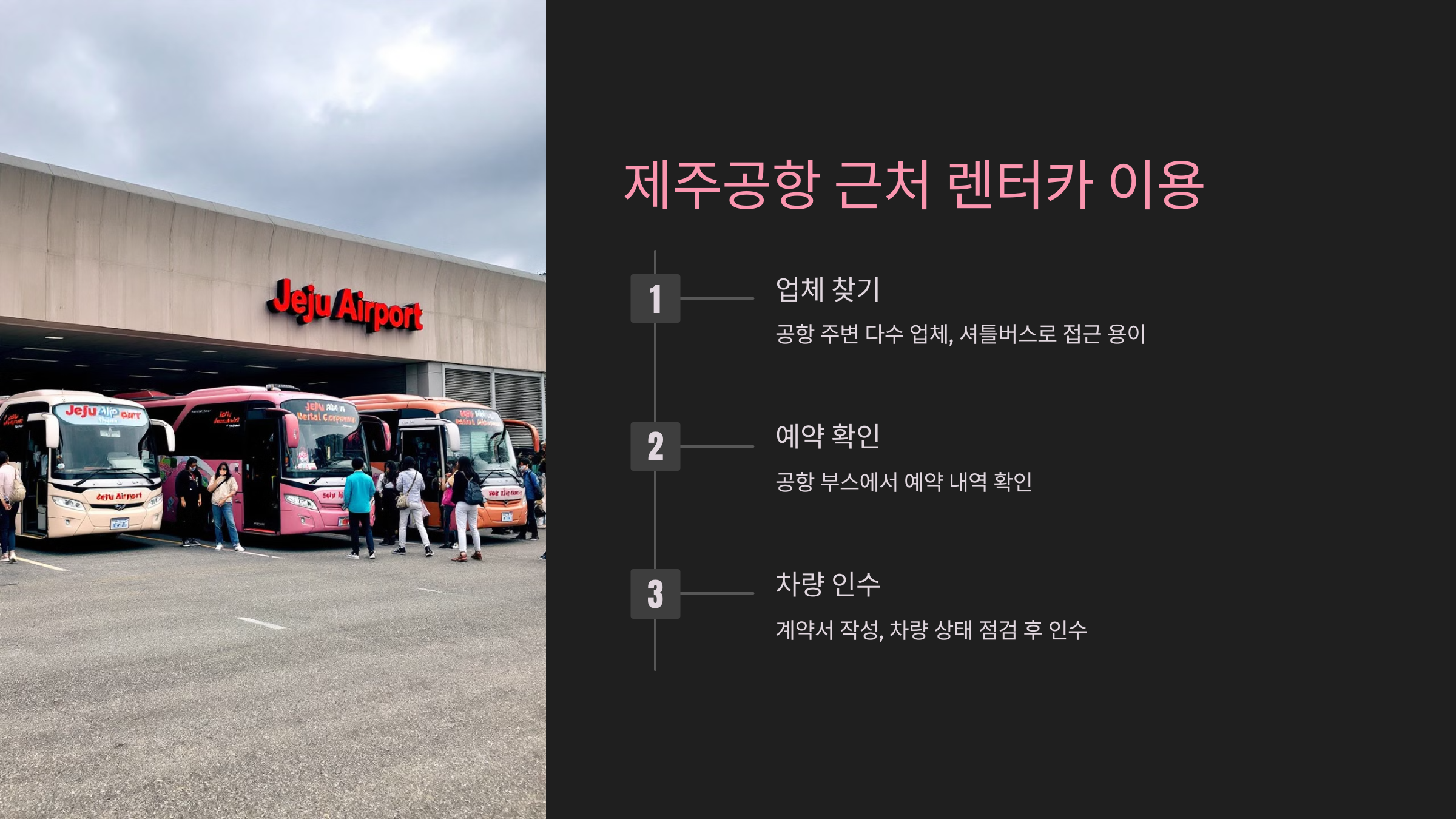 - 셔틀버스 이용: 공항 내 지정된 렌터카 셔틀버스 정류장에서 대기 후, 각 렌터카 업체의 사무실로 이동합니다.