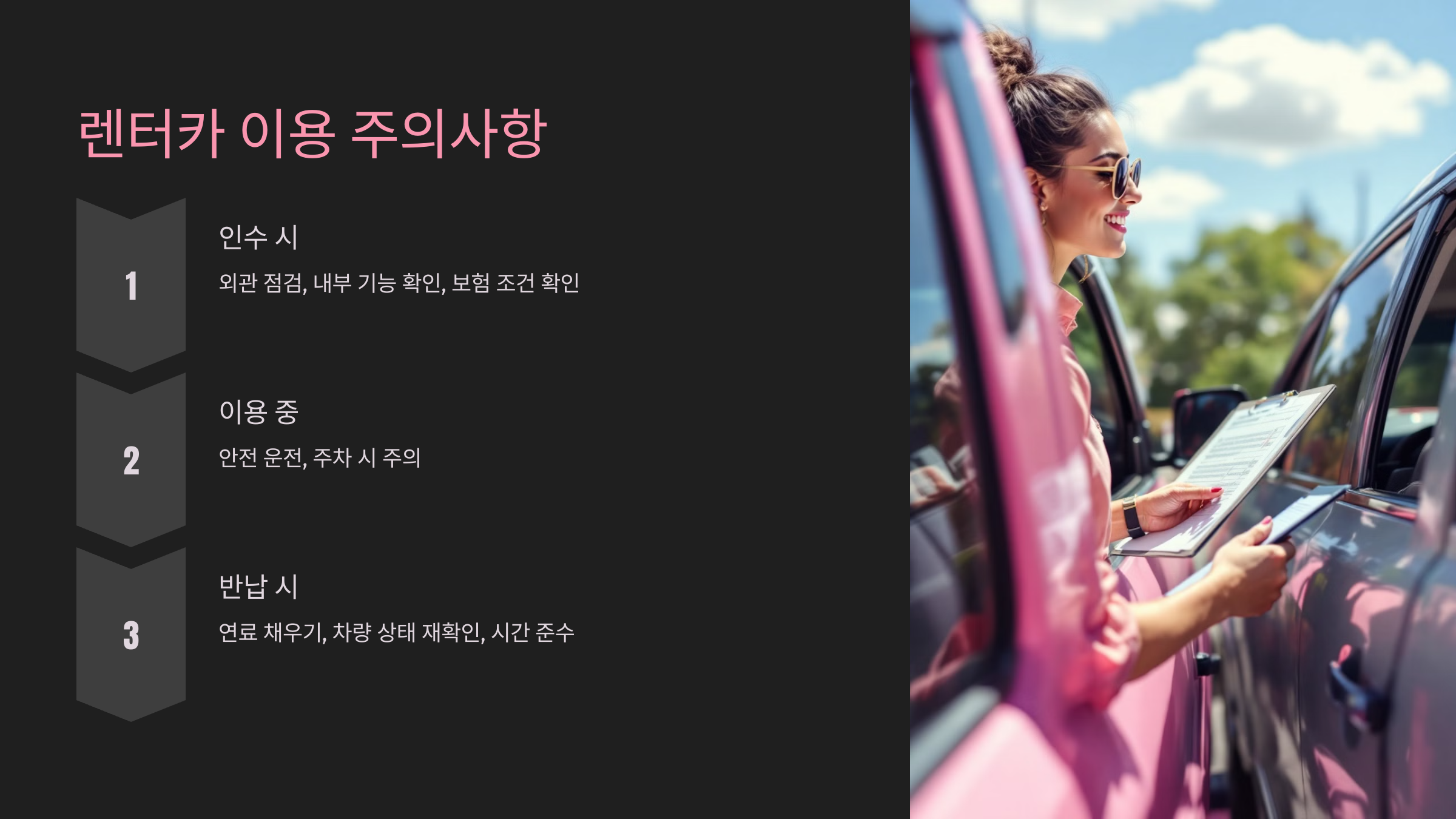 - 차량 인수: 업체 사무실에서 계약서 작성 후 차량의 외관과 내부 상태를 점검한 뒤 인수받습니다. 차량의 연료 상태와 추가 장비, 보험 사항 등을 꼼꼼히 확인해야 합니다.