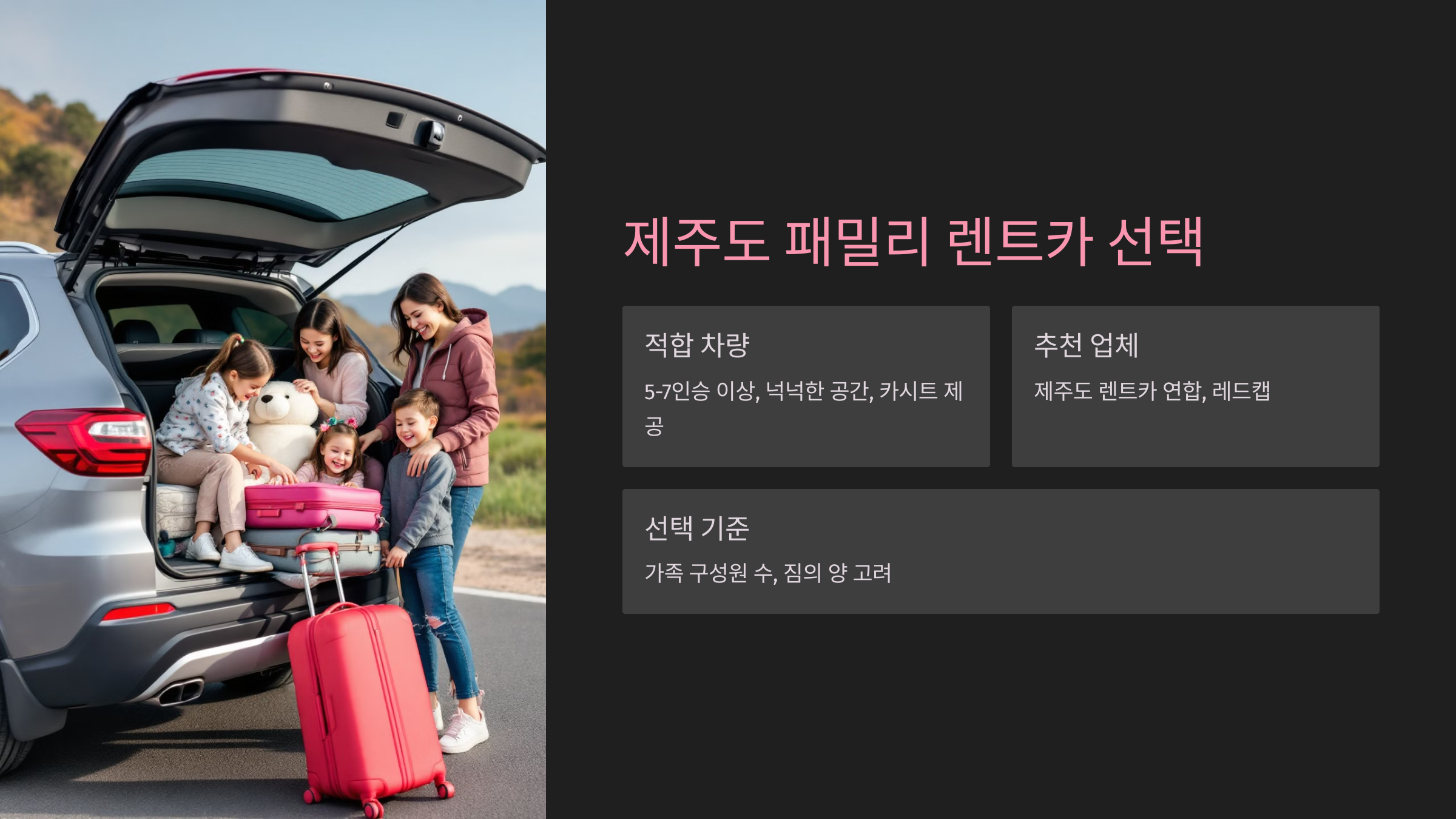 제주도로 가족 여행을 떠나는 경우 5~7인승 이상의 패밀리카를 선택하는 것이 좋습니다. 넉넉한 좌석 공간과 큰 트렁크는 유모차, 캠핑 장비 등 부피가 큰 짐을 싣는 데 유리합니다. 또한, 어린이를 동반한 여행이라면 카시트 제공 여부를 사전에 확인하는 것이 중요합니다.