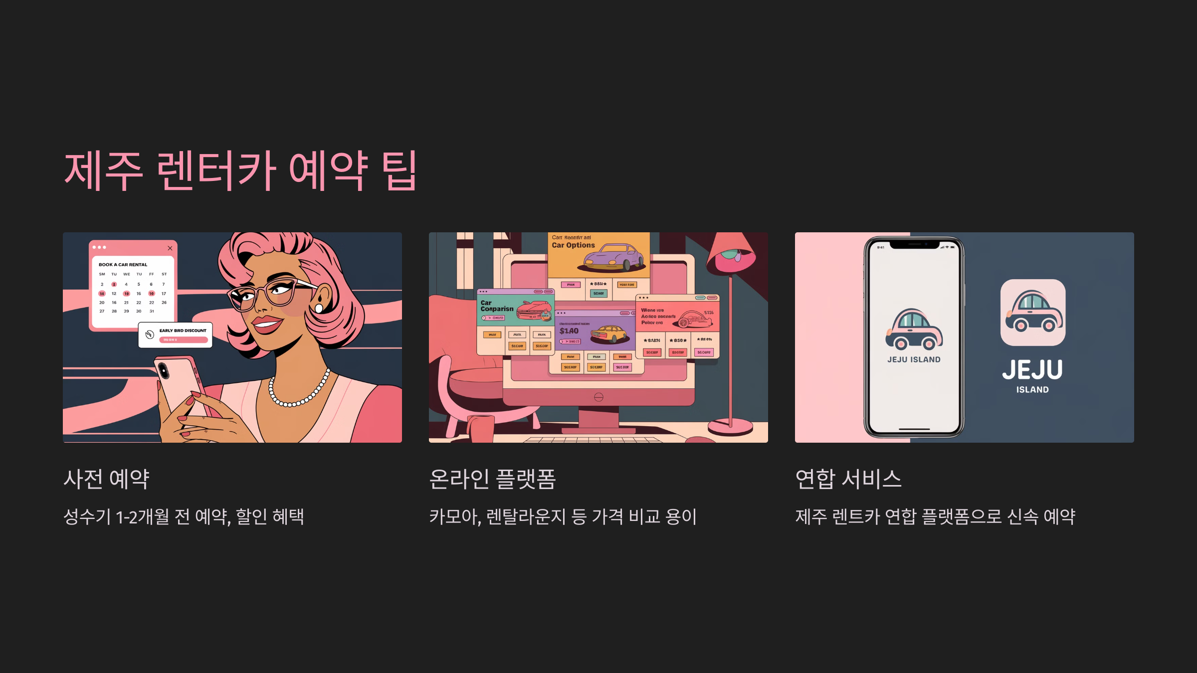 제주도는 빼어난 자연경관과 풍부한 문화적, 관광적 매력을 자랑하는 대표적인 여행지입니다. 특히 효율적인 이동수단을 선택하는 것이 쾌적한 여행의 성패를 가를 만큼 중요합니다. 대중교통의 접근성은 제한적이고 택시 이용은 다소 부담스러운 경우가 많아, 많은 여행자들이 렌터카를 선호합니다. 이 글에서는 제주렌터카를 처음 이용하는 분들도 알기 쉽게 예약 방법부터 차량 반납까지의 모든 과정을 상세히 설명합니다. 또한 제주공항 근처 렌터카 업체 정보, 가격 비교 팁, 이용 시 주의사항을 포함해 제주도 여행을 더 풍성하게 만드는 다양한 정보를 제공합니다. 렌터카를 잘 활용하면 시간과 비용을 아끼는 것은 물론 여행의 만족도를 한층 높일 수 있습니다.