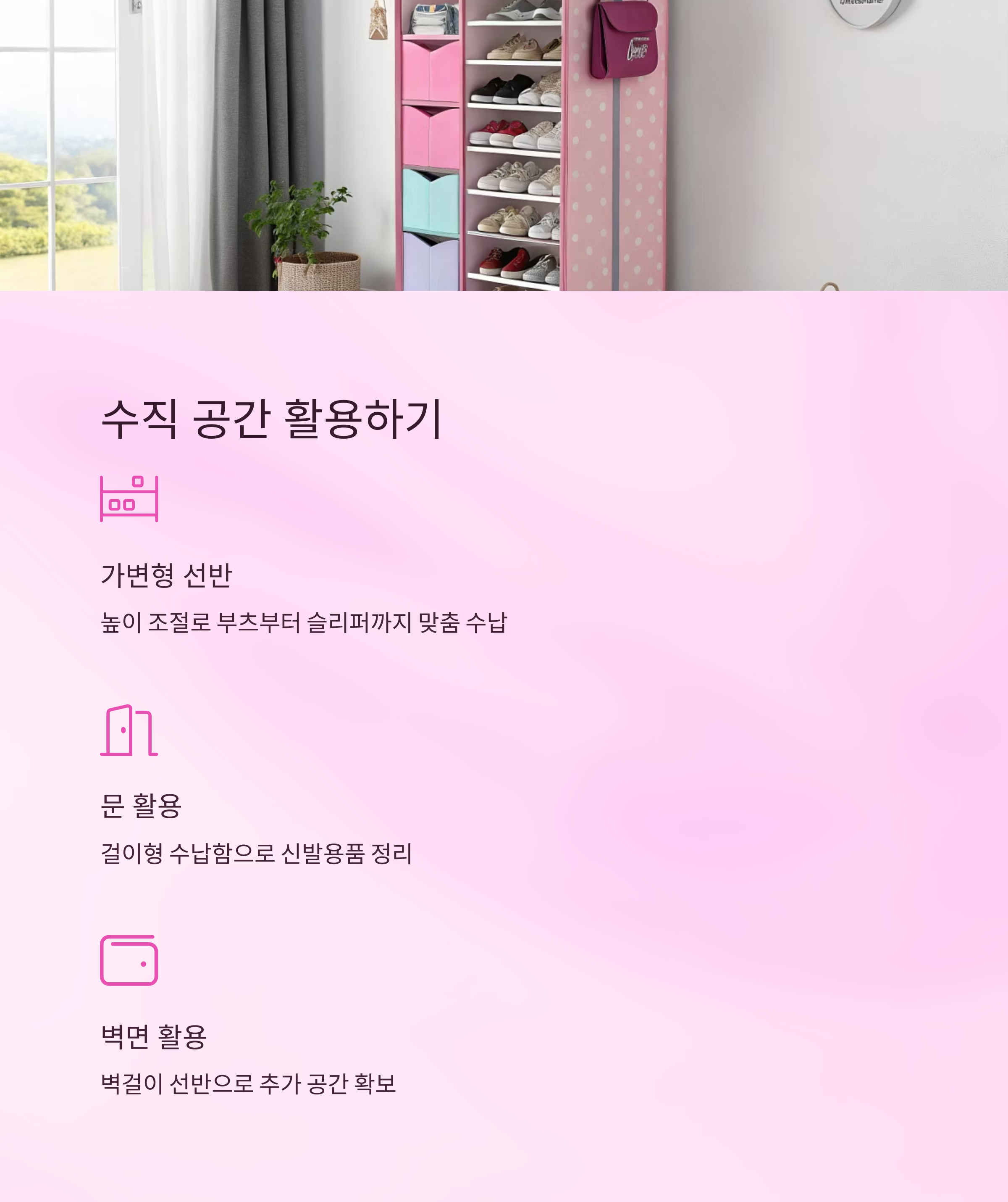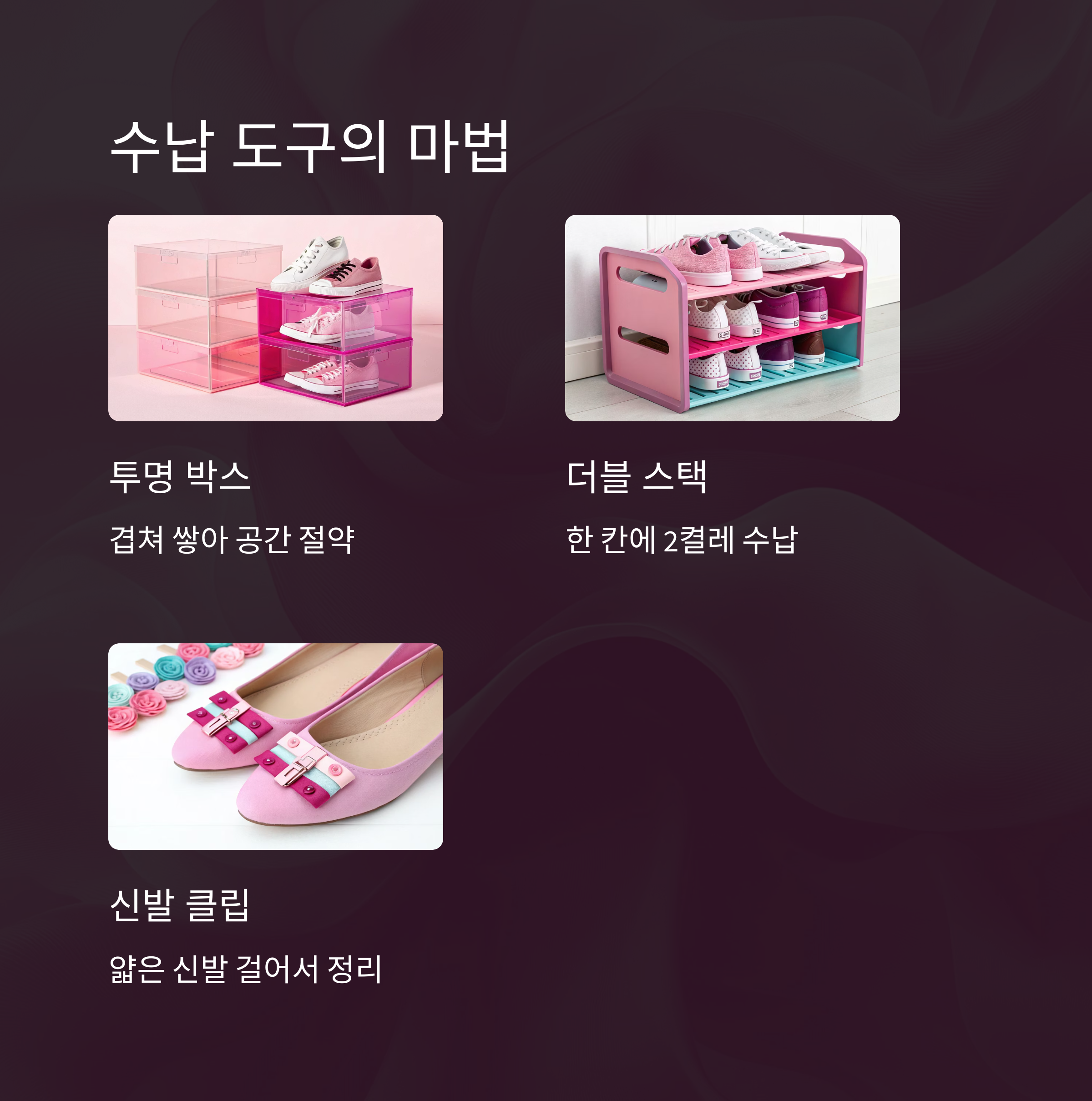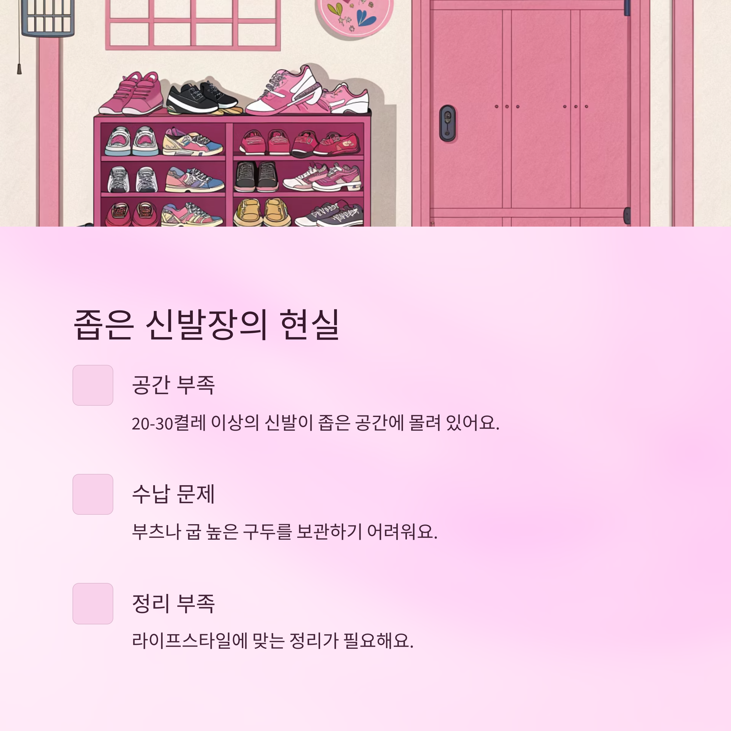 | 공간 부족 | 신발 수 과다, 정리 미흡 | 계절 분류, 수직 활용 |