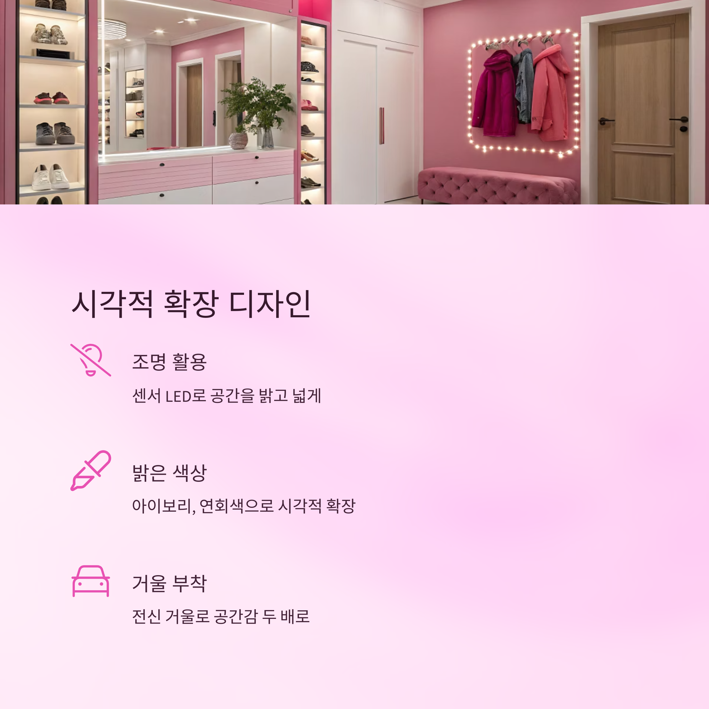 | 거울 부착 | 전신 거울, 미니 거울 | 공간 확장 효과 극대화 |