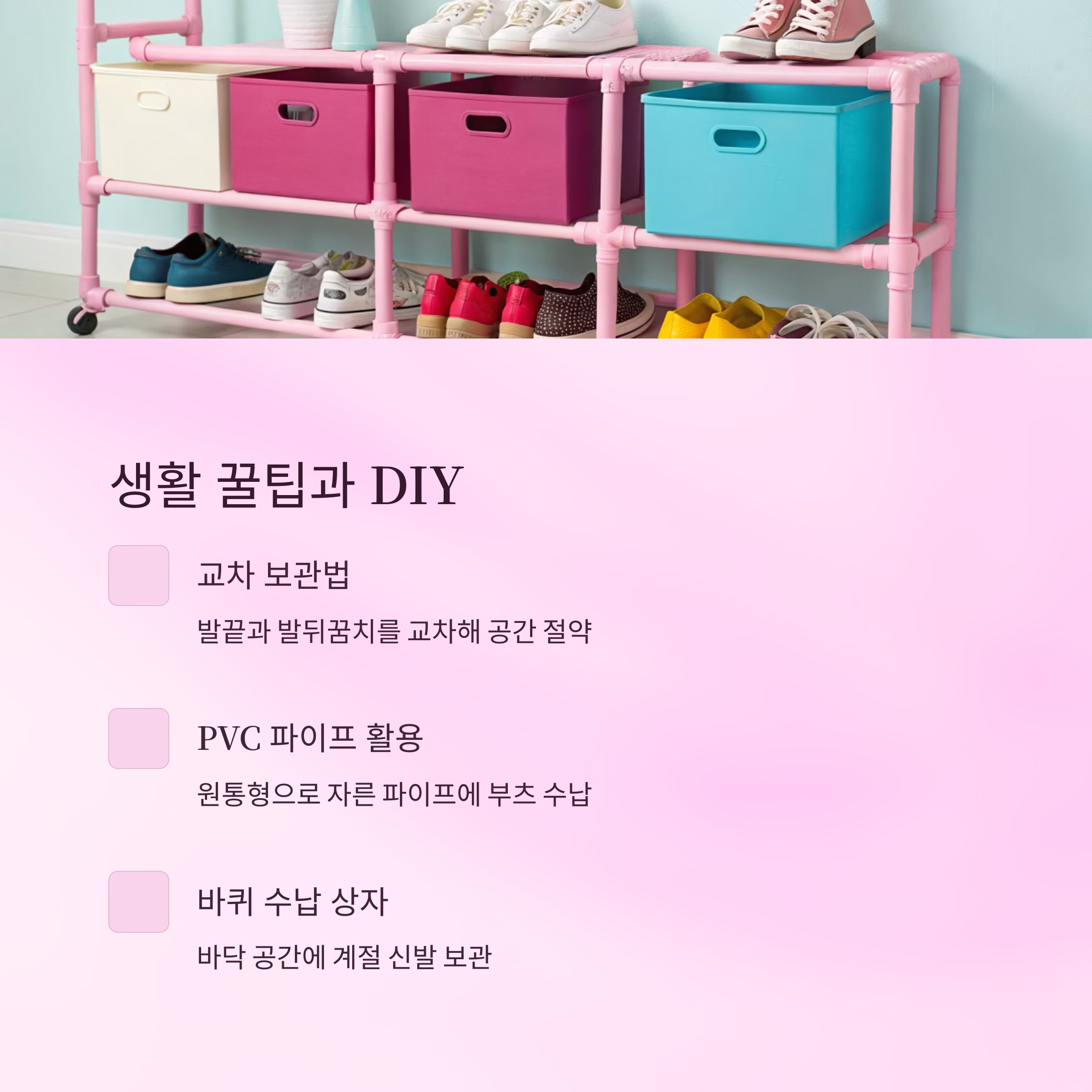 | PVC 파이프 수납 | 원통형 구조물로 수납 | 부츠, 힐 |