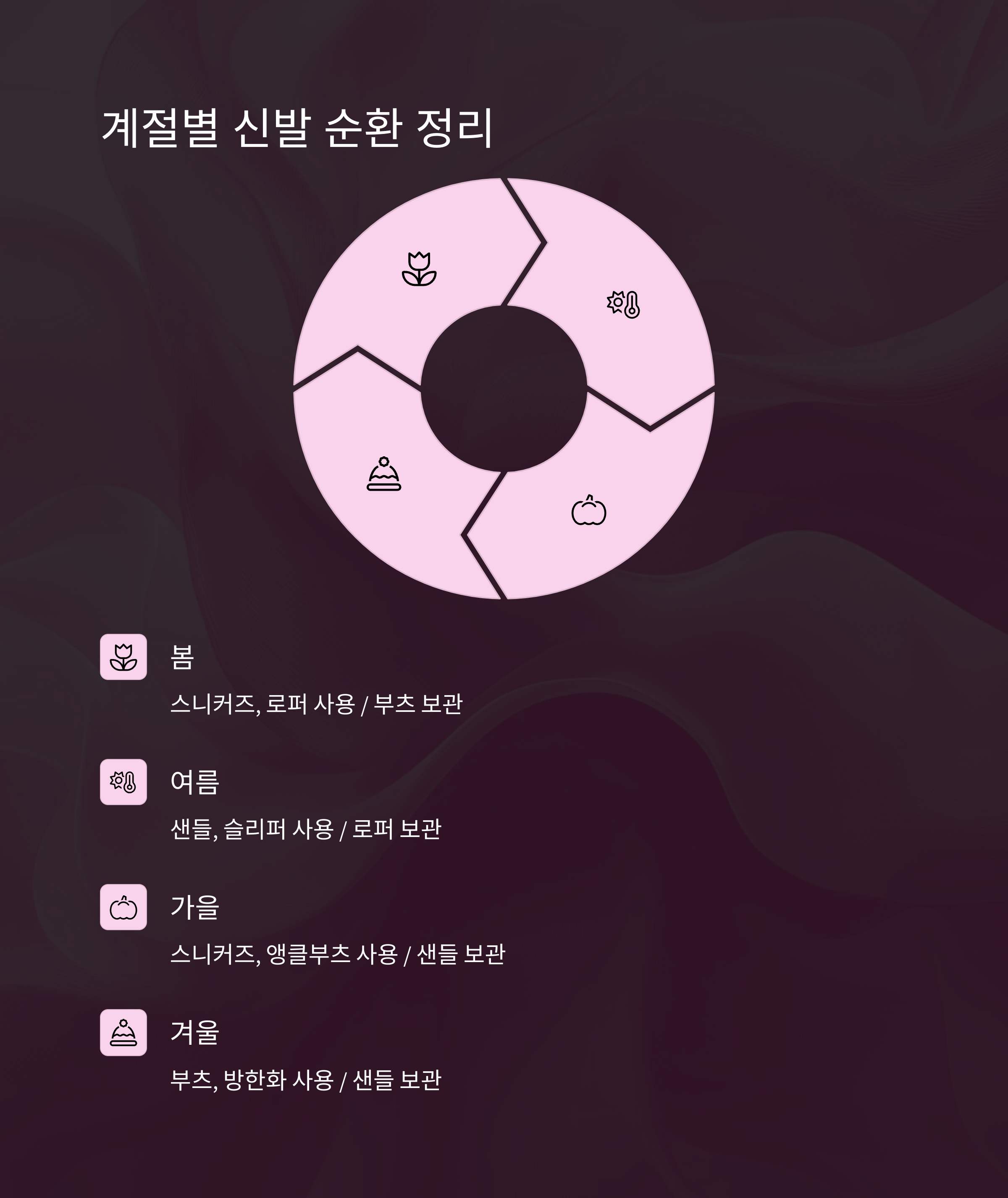 | 계절 | 착용 신발 | 보관 신발 | 정리 시기 |