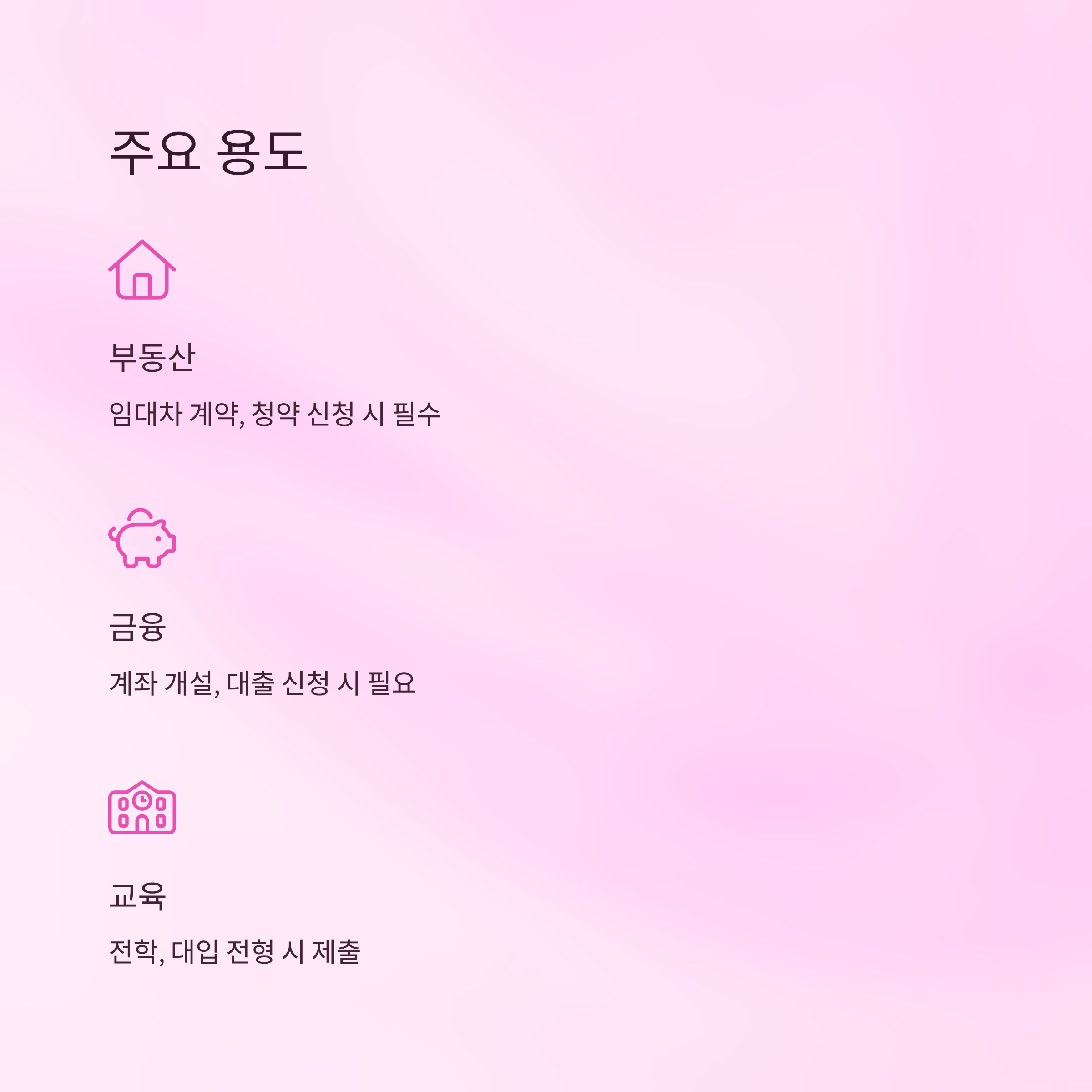 뿐만 아니라, 금융기관에서는 계좌 개설, 대출 신청, 신용카드 발급 등 신분과 거주지를 함께 확인하는 절차에서 꼭 요구해요. 병원에서 장기요양 신청을 하거나 요양병원 입원 시에도 가족관계와 주소지 증명이 동시에 필요한 경우가 많기 때문에 자주 쓰인답니다.
