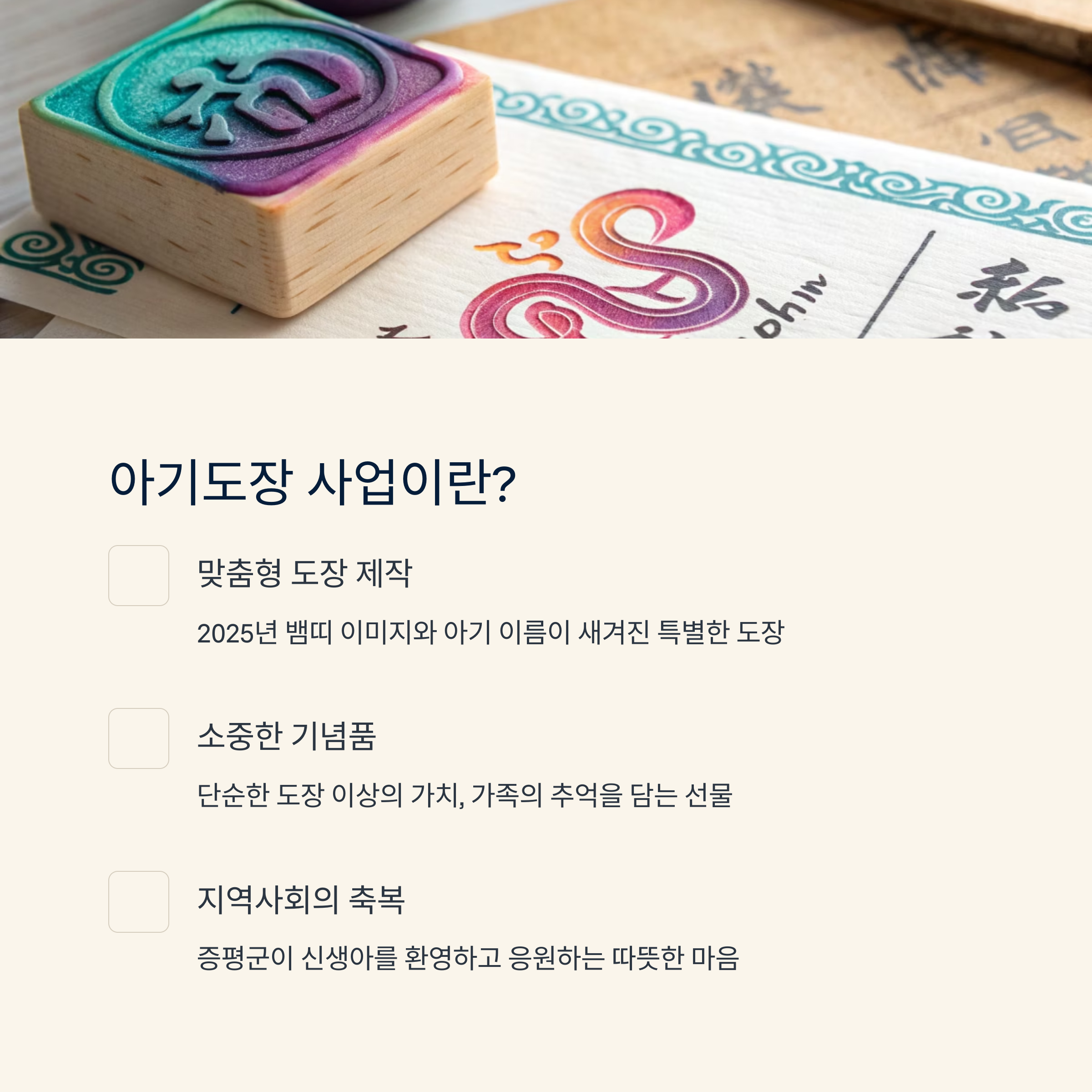 출생아 아기도장 지원 사업은 2025년 증평군에서 출생한 아기들에게 동물띠를 반영한 맞춤형 도장을 제작해주는 복지 사업이에요. 아이의 출생을 소중하게 기념하고, 가족에게 특별한 추억을 남기려는 의도에서 마련된 것이랍니다.