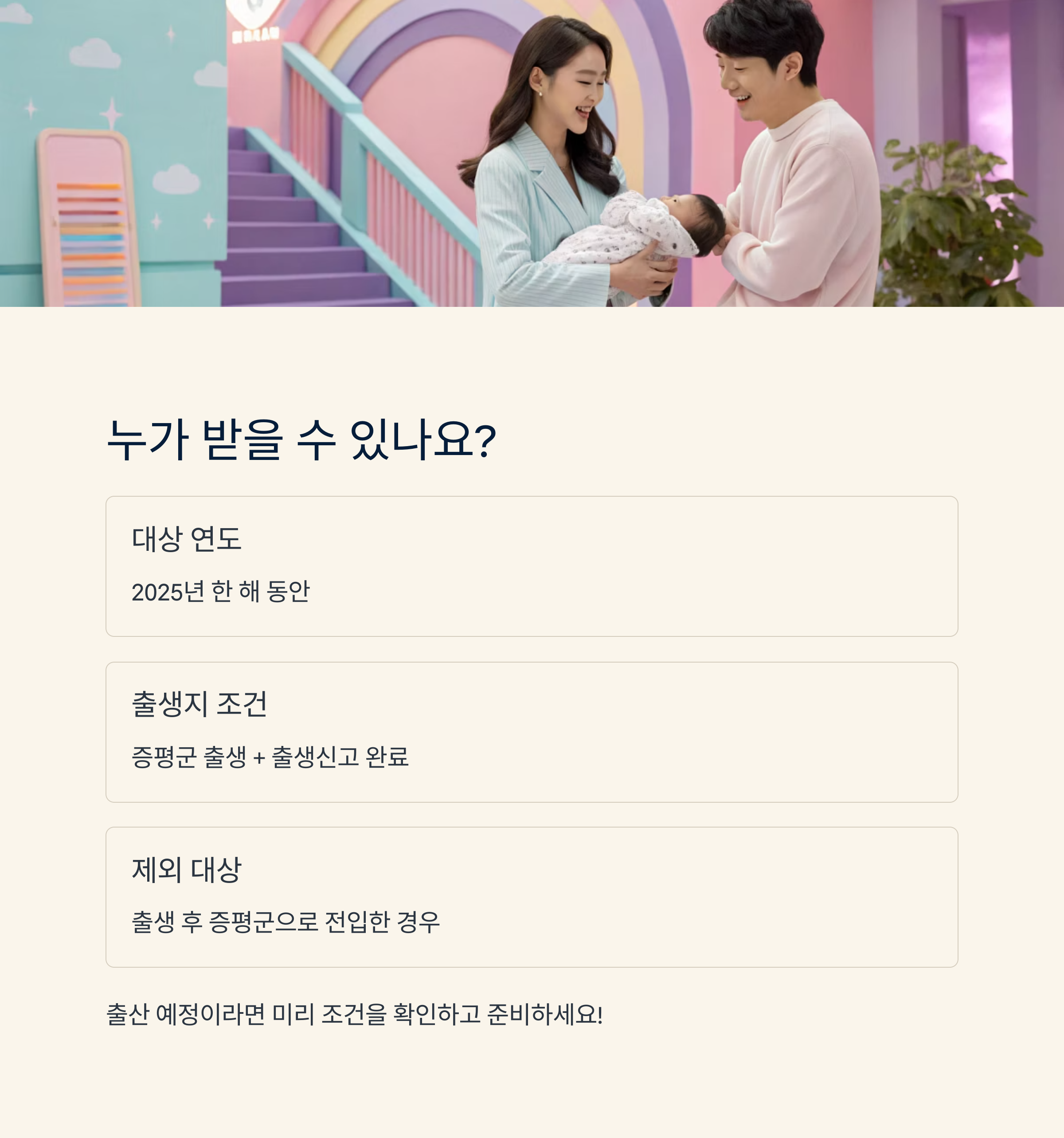 단, 신청은 ‘출생신고 시점’을 기준으로 처리되기 때문에 출생일이 2025년이라도 신고가 2026년으로 넘어가면 대상에서 제외될 수 있어요. 그러니까 출산 후 빠르게 신고하는 게 가장 안전한 방법이에요!