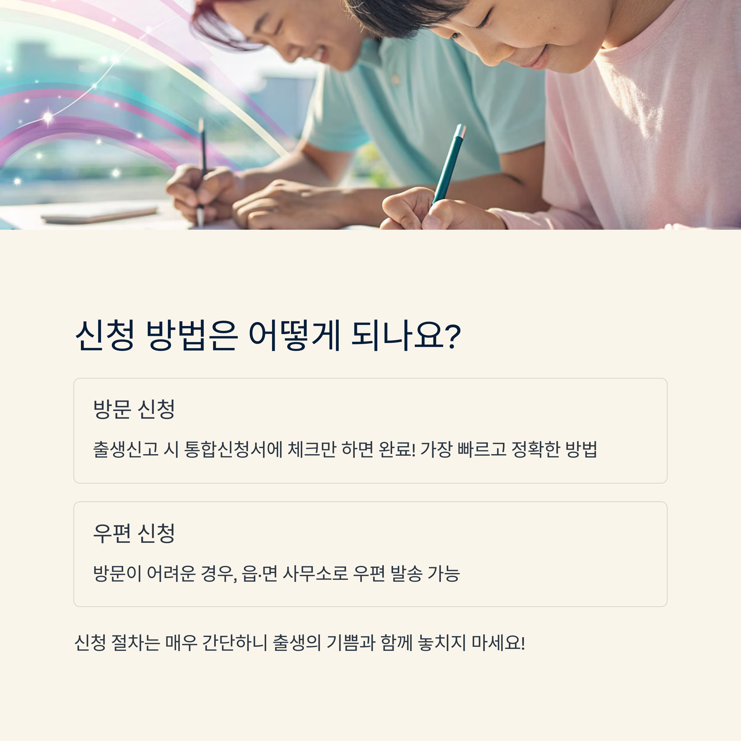 신청 방식은 크게 두 가지로 나뉘어요. 첫째는 직접 방문 신청이고, 둘째는 우편 발송이에요. 직접 방문하는 경우는 출생신고와 함께 처리가 가능해 가장 빠르고 정확해요. 우편 신청은 부득이하게 센터 방문이 어려운 경우 활용하면 돼요.