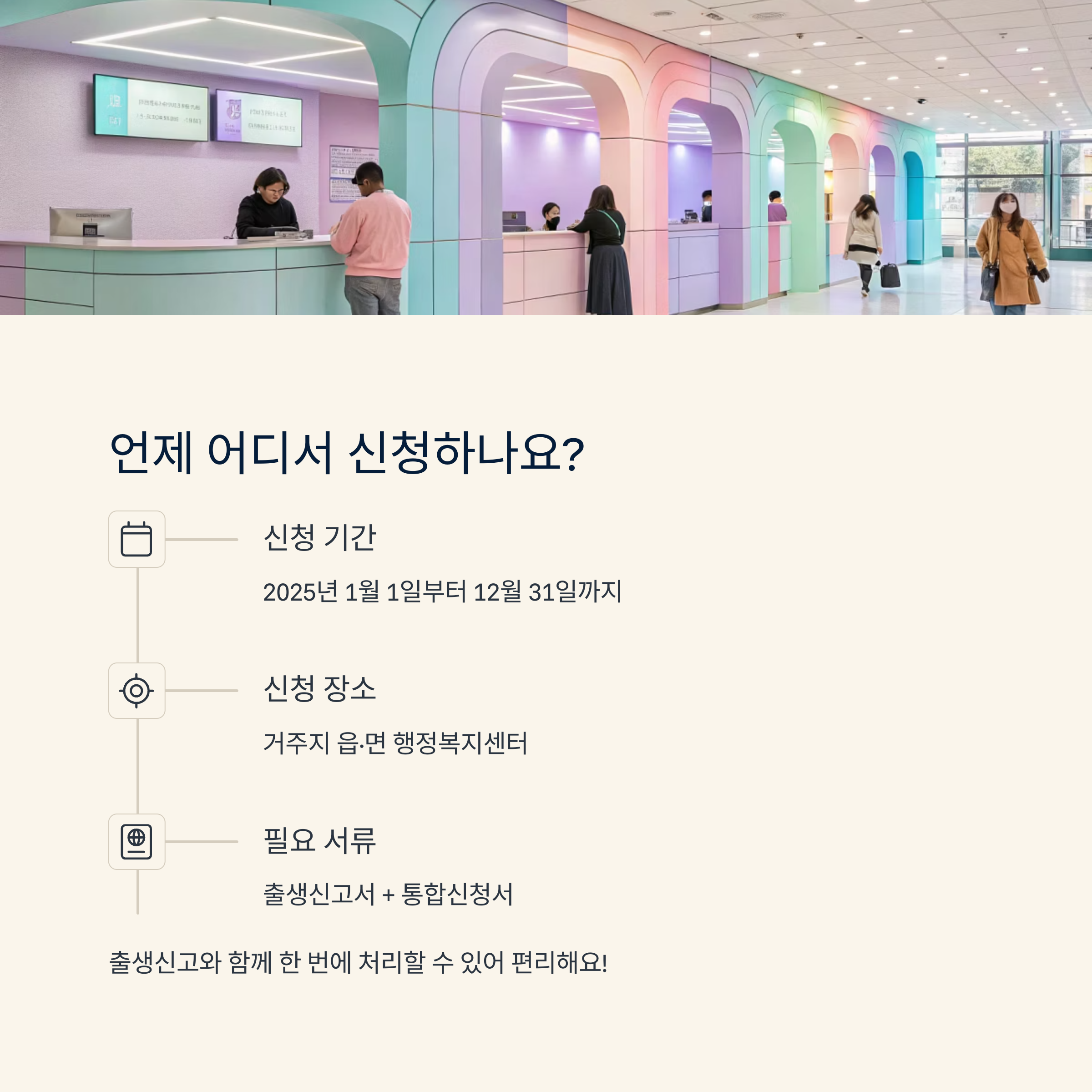 이처럼 별도 방문 없이 한 번에 출생신고와 함께 처리할 수 있다는 점이 가장 큰 장점이에요. 바쁜 초보 부모들에게 정말 유용하죠! 👪