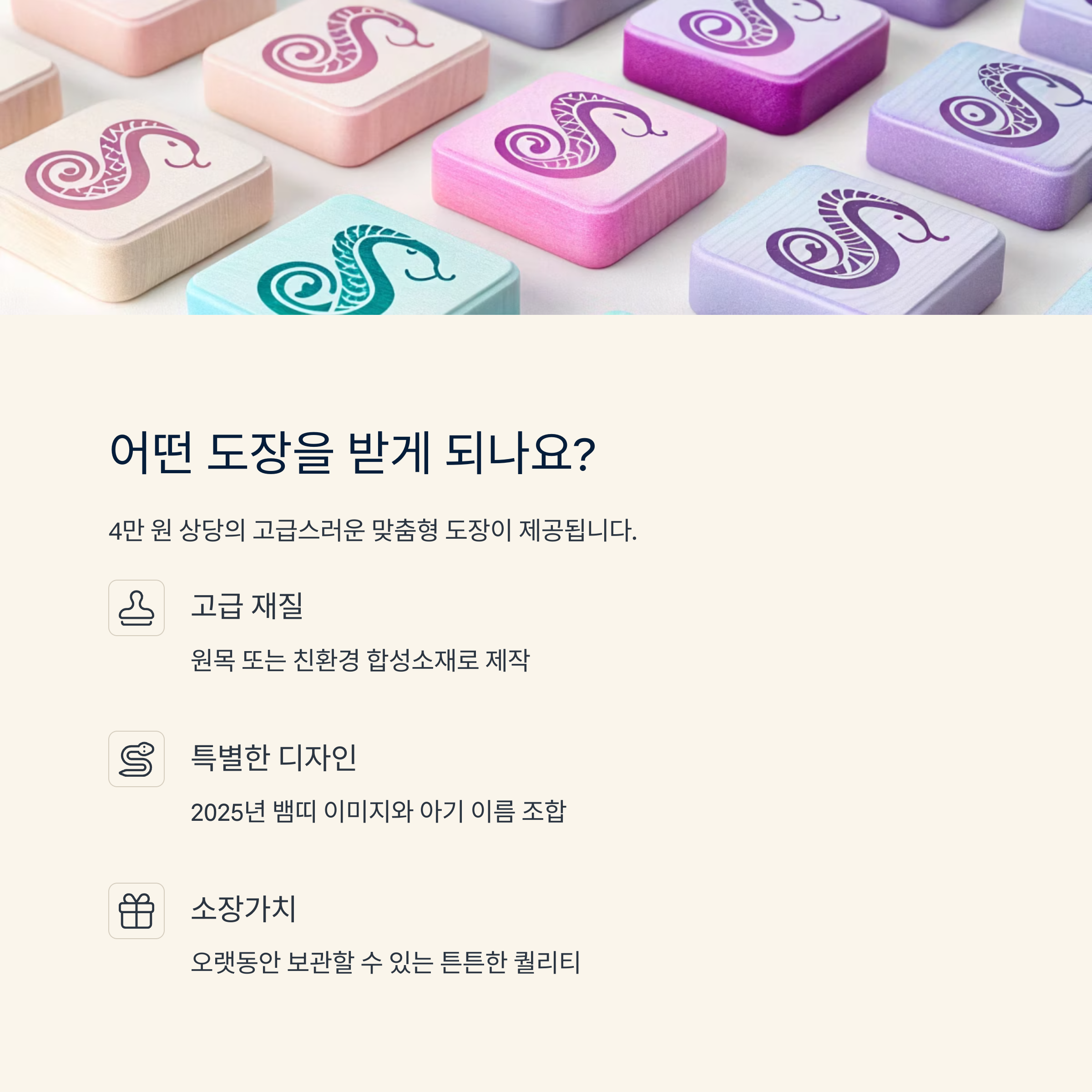 도장은 전통적인 도장 제작 기법과 현대적인 디자인이 결합된 형태로, 아이의 이름과 2025년의 띠인 '뱀띠'를 상징하는 이미지가 함께 담기게 돼요. 소장가치도 높고, 나중에 아이가 자라서도 가족 간의 애정을 느낄 수 있는 추억이 될 거예요.