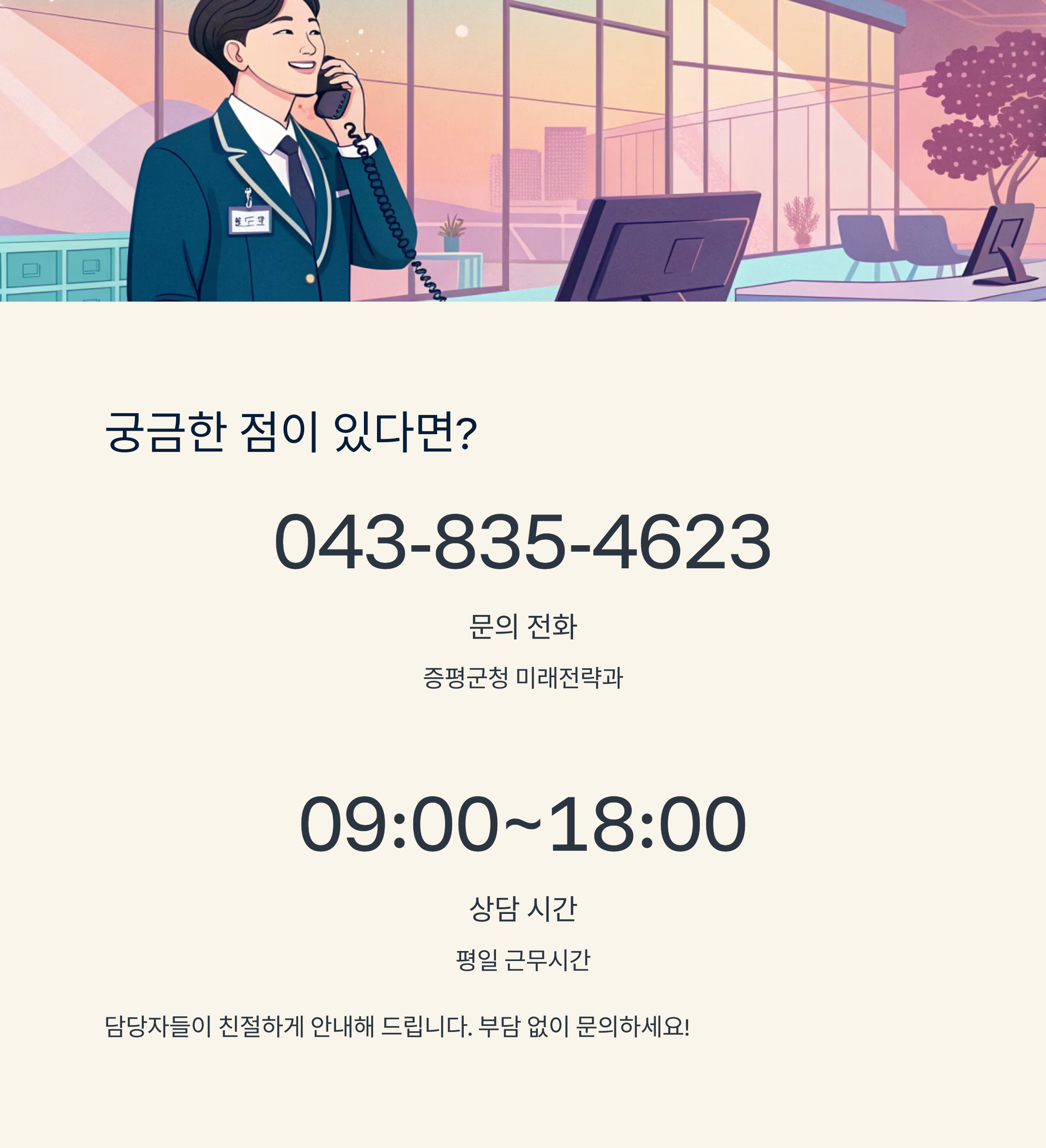 혹시 신청 과정이나 자격 조건에 대해 더 궁금한 점이 있다면, 증평군청 미래전략과로 문의하면 자세하게 안내받을 수 있어요. 실제 담당 부서가 관리하고 있기 때문에, 정확하고 신속한 답변을 받을 수 있답니다. 😄
