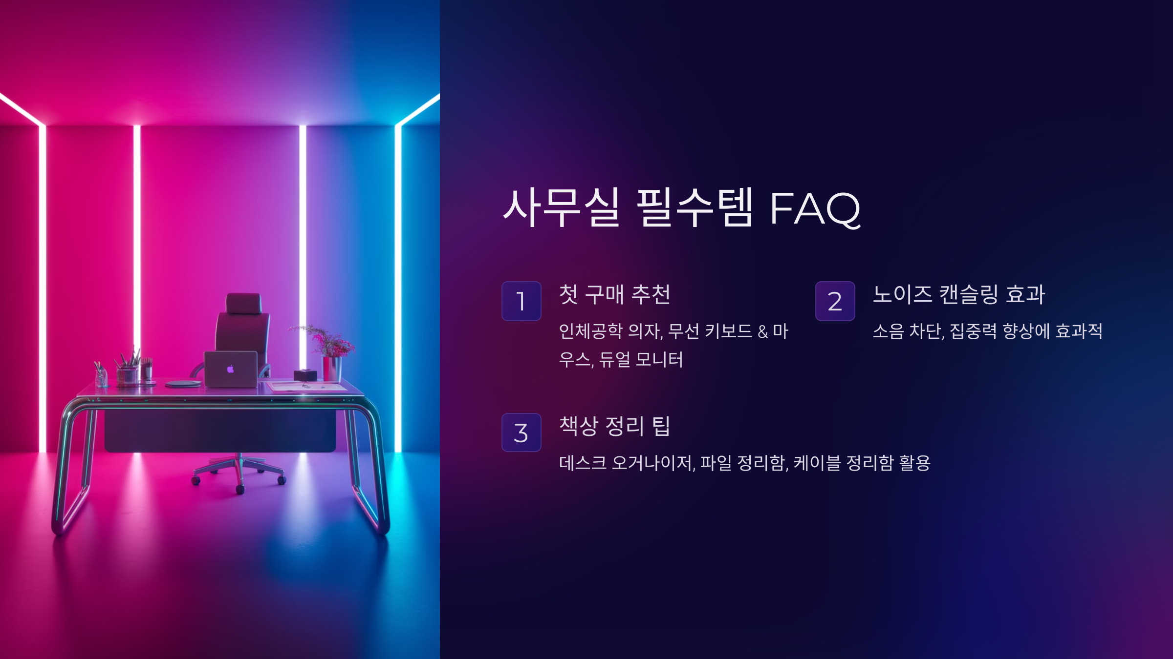 A1. 인체공학 의자, 무선 키보드 & 마우스, 그리고 듀얼 모니터가 가장 추천돼요. 업무 효율과 건강을 동시에 챙길 수 있어요.