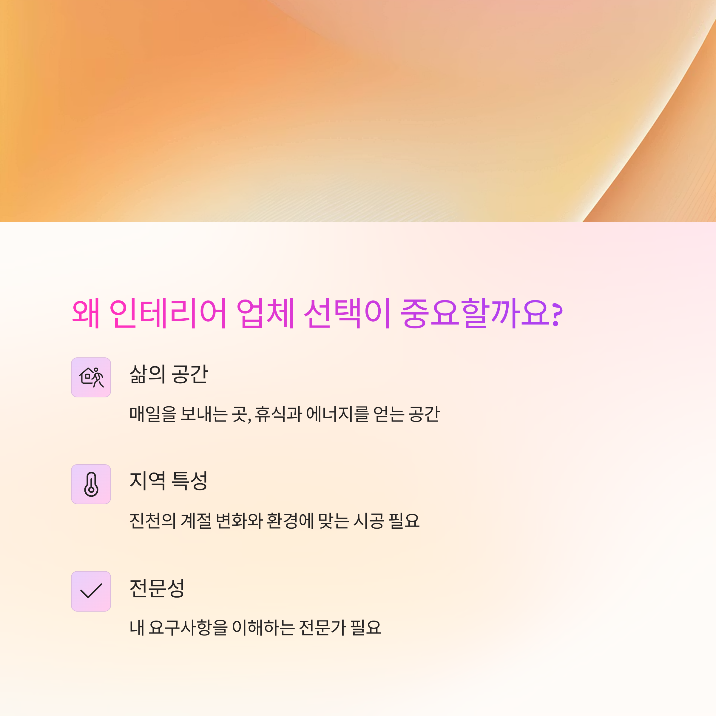진천에서 인테리어 업체를 선택할 때 가장 먼저 생각해야 할 건 '삶의 공간을 누구에게 맡기느냐'에 대한 신중함이에요. 인테리어는 단순한 시공이 아니라 생활의 일부가 되기 때문이죠. 집이라는 공간은 매일을 보내는 곳이고, 그 안에서 휴식과 에너지를 얻는 만큼, 제대로 된 업체를 만나는 게 무엇보다 중요하답니다.