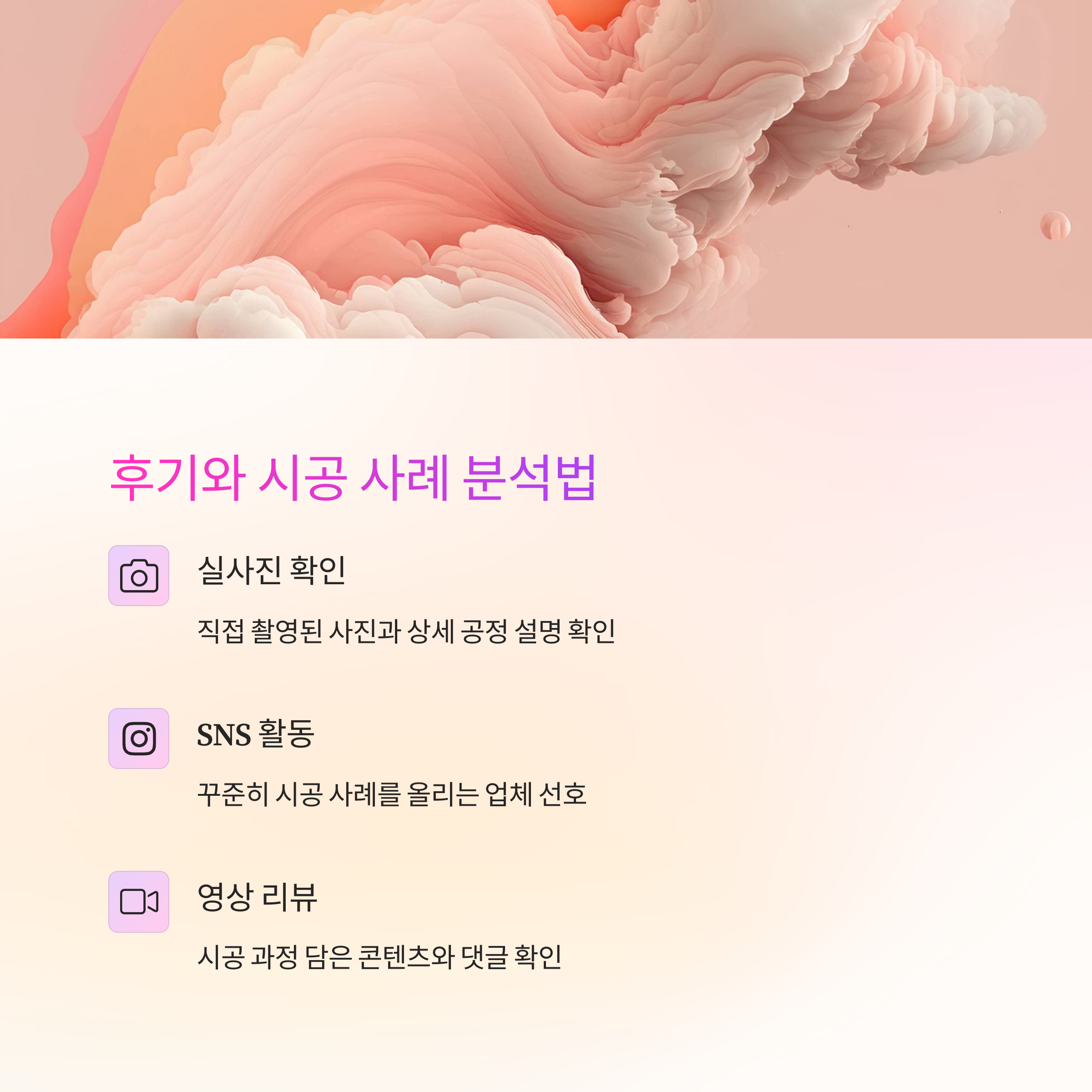 또한 업체가 자체적으로 운영하는 인스타그램이나 블로그도 참고하면 좋아요. 꾸준히 시공 사례를 올리는 업체는 그만큼 자신 있는 결과물을 보여주고 있다는 뜻이기도 하니까요. 반대로 사진만 있고 공정 과정 설명이 없는 곳은 주의해야 해요.
