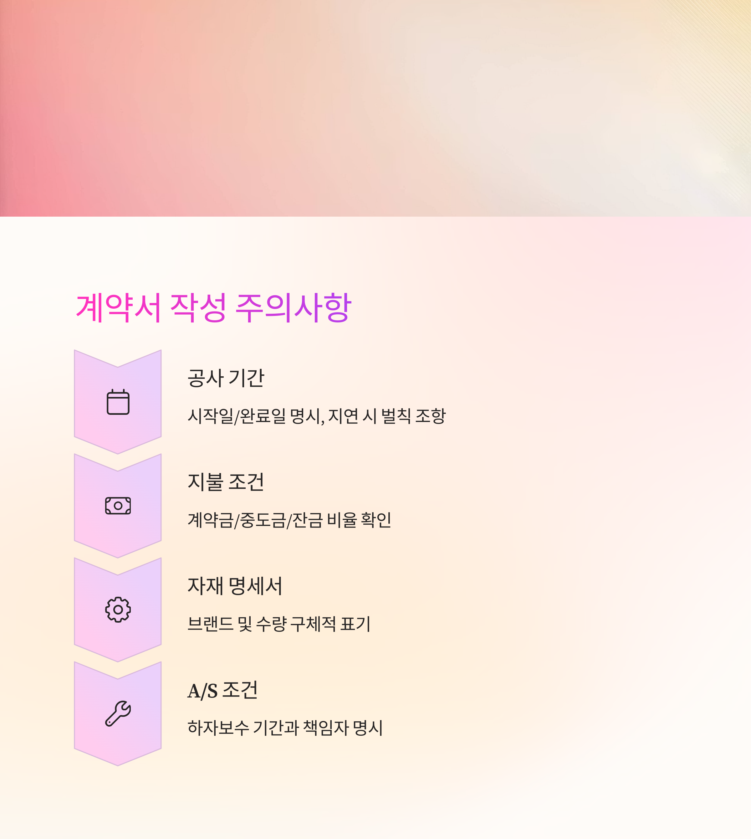 견적이 끝나고 마음에 드는 업체를 골랐다면 이제는 계약 단계예요! 이때 작성하는 계약서는 단순히 ‘공사 진행’의 의미를 넘어, 추후 문제가 생겼을 때 내가 나를 지키는 유일한 수단이 된다는 점 꼭 기억해요.