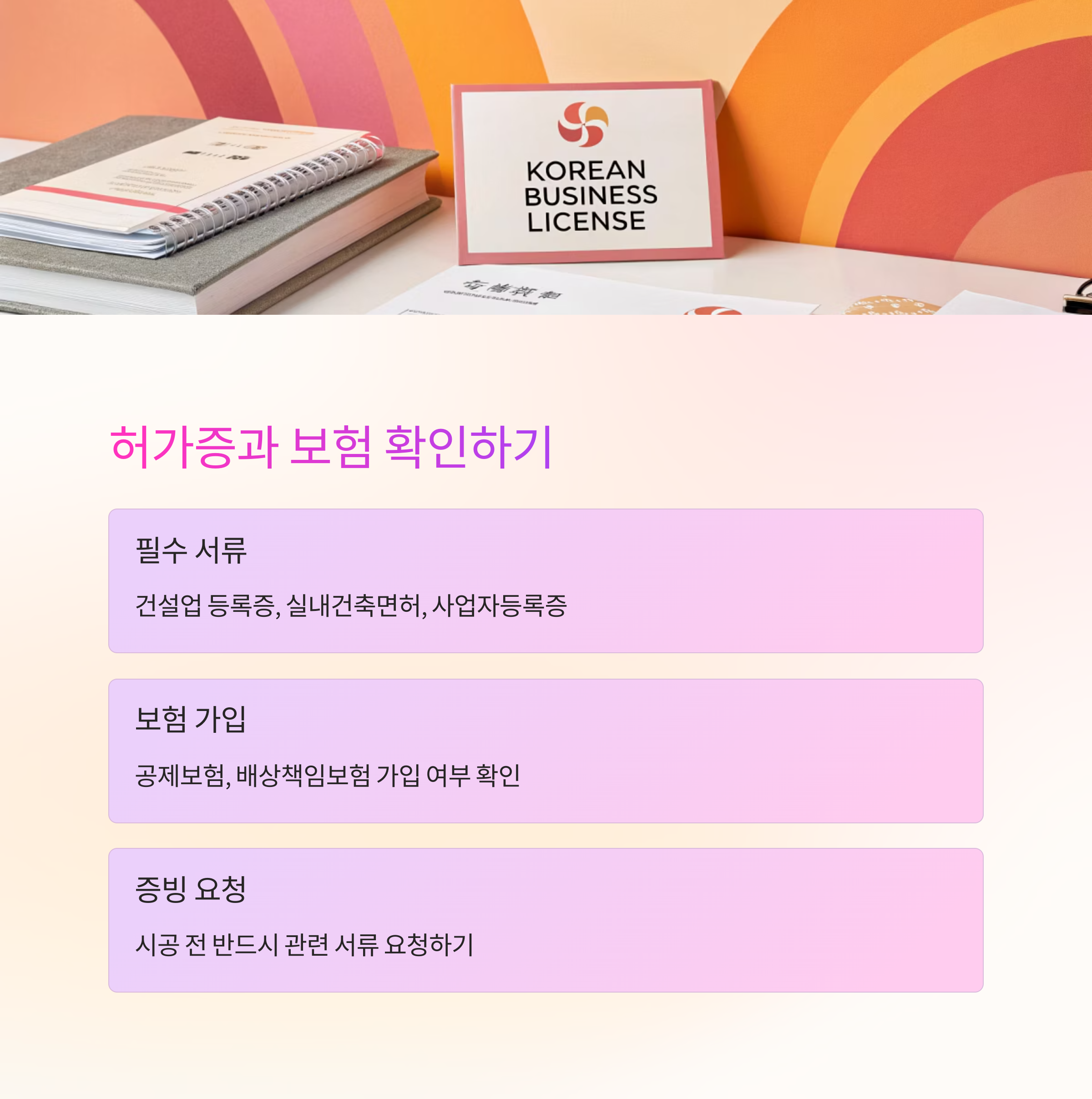 인테리어 업체를 고를 때 간과하기 쉬운 부분이 바로 ‘합법적인 자격과 보험 가입 여부’예요. 하지만 이 부분은 정말 정말 중요해요. 혹시 모를 사고나 하자 발생 시에도 법적으로 보호받을 수 있는 장치가 되거든요.