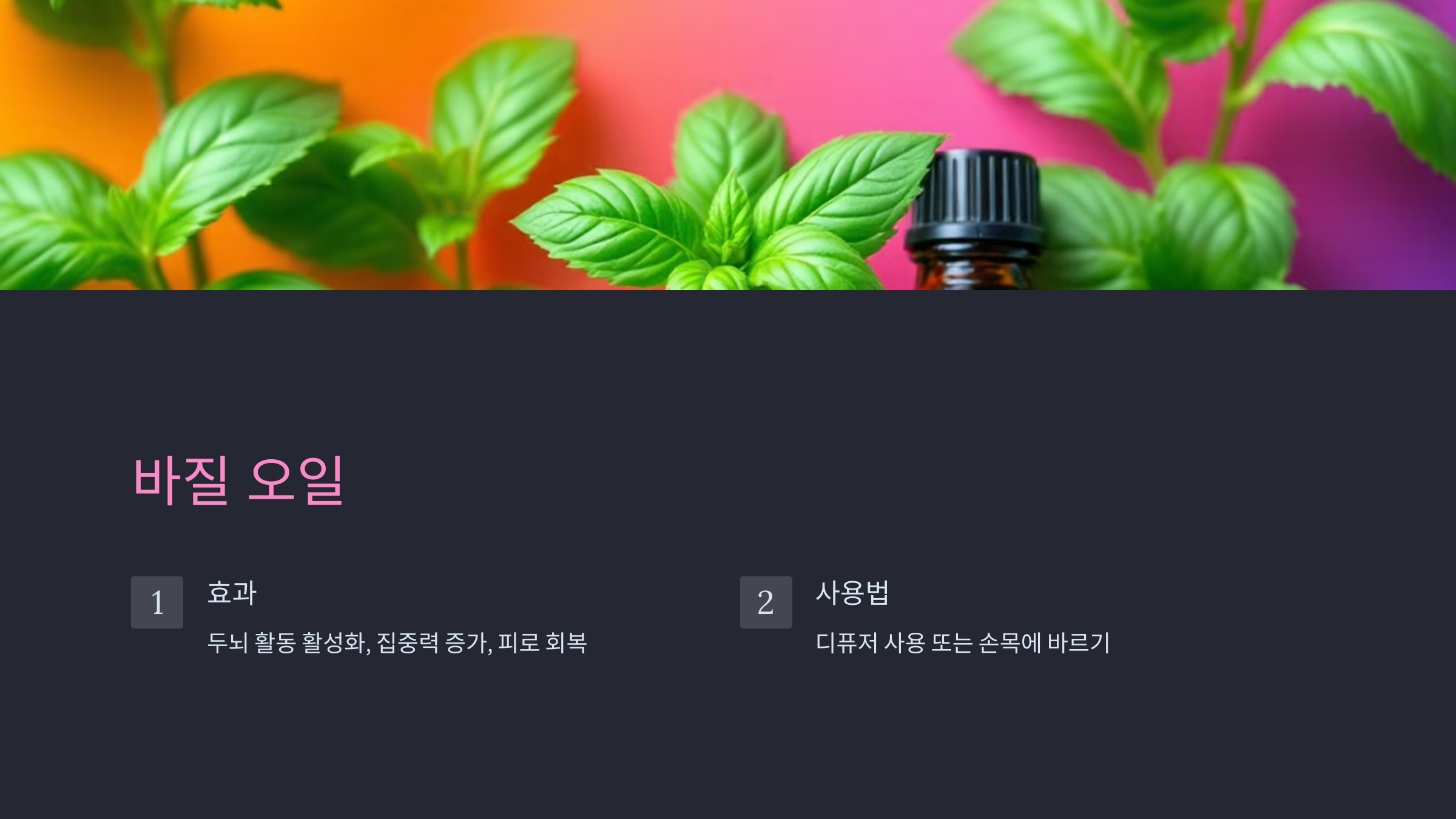 바질 오일은 신경을 자극하고 두뇌 활동을 활성화시켜 집중력과 주의력을 높이는 데 유용한 오일입니다. 특히 마음이 산만하거나 피로감이 밀려올 때 활력을 주는 향으로, 창의력 증진에도 도움이 됩니다.