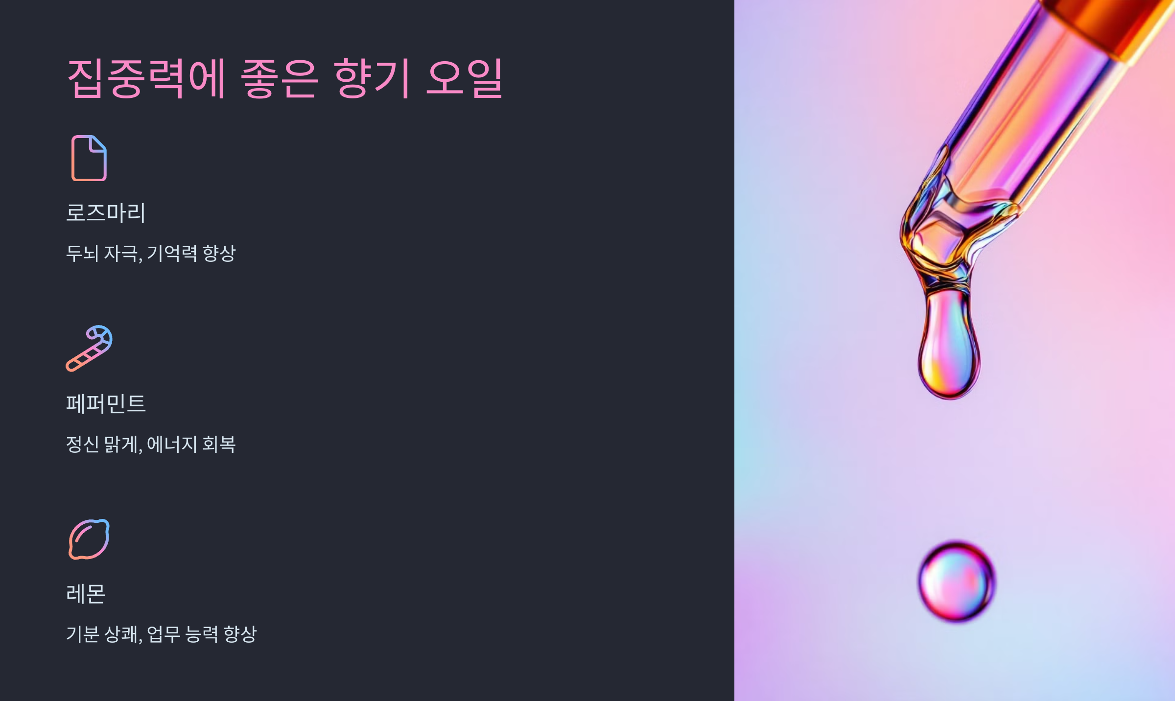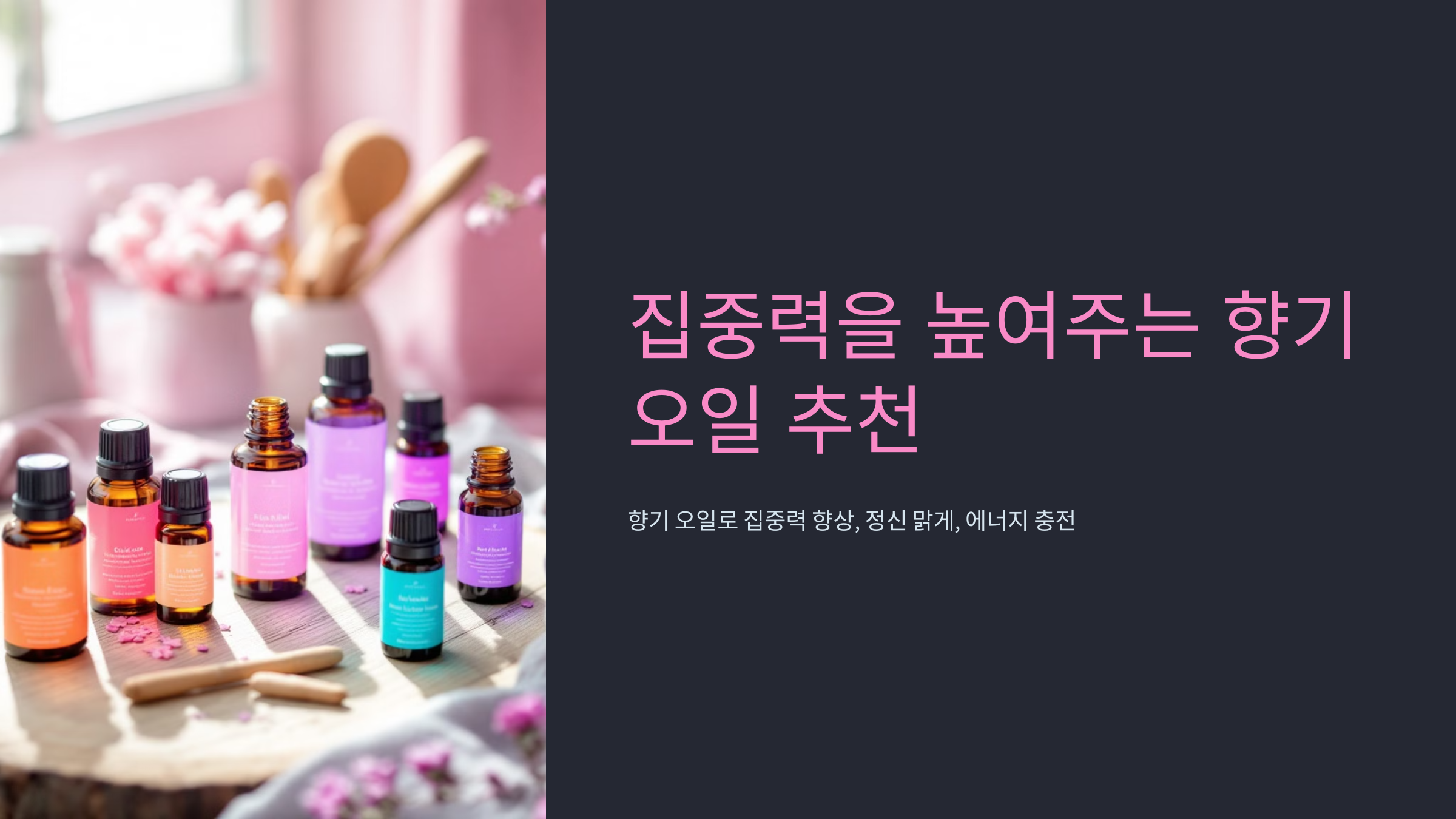 업무나 학업 중에 쉽게 집중력이 떨어지나요? 일상 속에서 집중력을 유지하고 싶다면 향기 오일을 활용해 보세요! 향기 오일은 자연스러운 방식으로 정신을 맑게 하고, 에너지를 충전하며, 집중력을 높이는 데 큰 도움을 줄 수 있습니다. 오늘은 집중력을 강화하고 싶은 분들을 위해 효과적인 향기 오일을 소개합니다. 😊